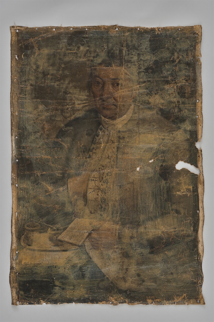 Čovjek srednjih godina sa sijedom kosom. Lice crveno sa crvenim usnama. Kaput tamno zelene boje. Oko vrata omotana bijela marama. Prsluk svijetli sa motivima cvijeća i red puceta. Desnu ruku je stavio u prsluk, u lijevoj drži pismo. U donjem lijevom uglu tintarnica sa perom. Pozadina tamna. (Inventarna knjiga 1-3, 1. tom)