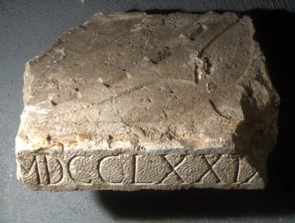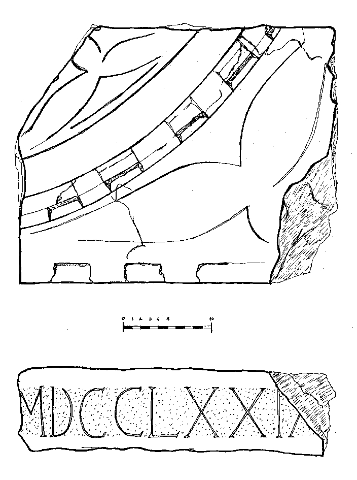 Kamena ploča sa dijelovima uklesanog grba (?). Kroz sredinu ulomka prolazi zakrivljena traka na kojoj se nalazi zupčasti ukras. Sa svake strane trake nalazi se ukras u obliku tri izdužena lista koji se spajaju u korjenu. Na bočnoj strani ploče rimskim je brojevima uklesana godina MDCCLXXIX.