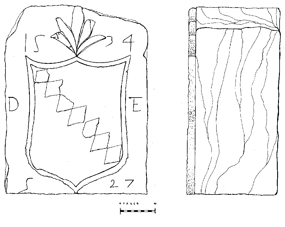 Plemićki grb Domenica (?) Teofania. Grb u obliku štita smješten je u središtu kamene ploče i izveden u visokom reljefu. Na vrhu grba je ljiljan, a unutar njega dijagonalno je raspoređeno sedam rombova (navodno oznaka za svakog pripadnika tršćanske grane ove obitelji). Iznad štita, između prikaza ljiljana, je u dva dijela navedena godina 1534; bočno od štita su uklesani inicijali D(omeniko ?) i TE(ofanio). Na dnu grba, odvojena krajem štita, je godina 1527. Navedene godine označavaju godine dviju vladavina iste osobe.
