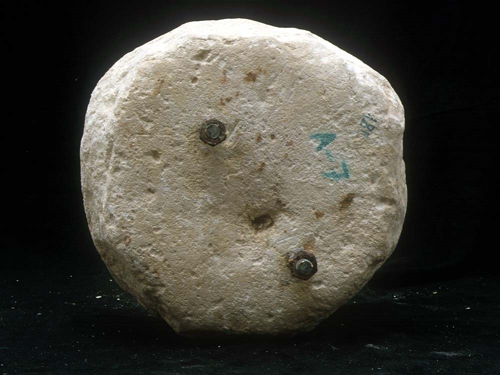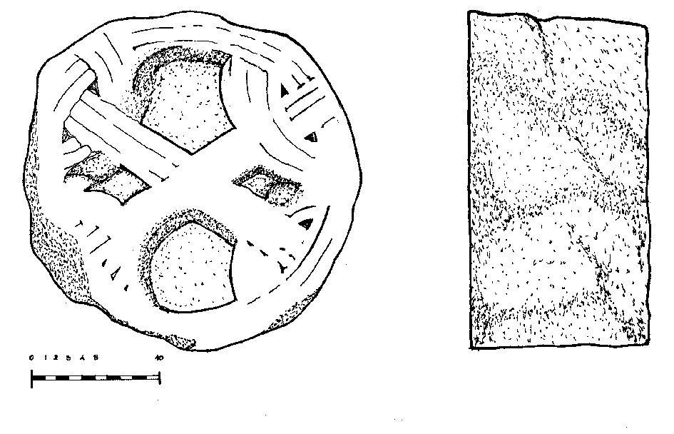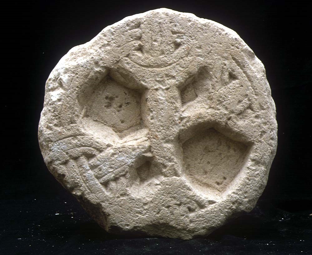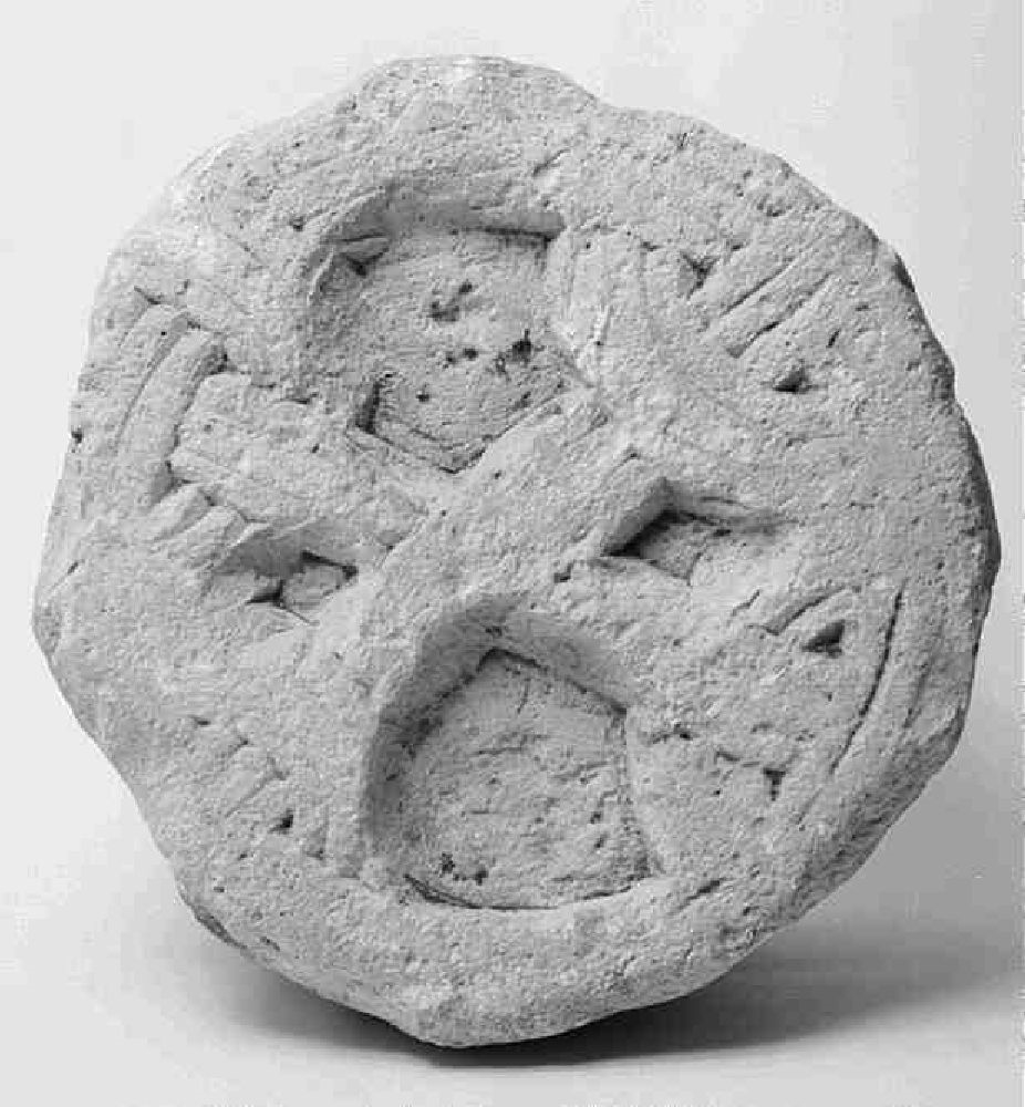 Kameni ulomak kružnog oblika ukrašen troprutim trakama. U središtu kružnice koju opisuje tropruta traka sijeku se druge dvije dvije troprute trake tvoreći pritom motiv u obliku slova X. Na mjestu gdje te trake sijeku troprutu traku koja opisuje kružnicu nalazi se čvor od troprutih traka.