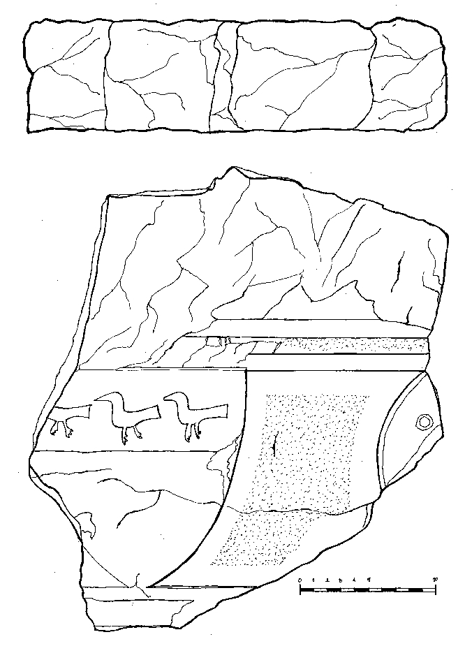 Ulomak friza na kojem se sa lijeve strane nalazi trokutasti štit, djelomično oštećen, u čijem se gornjem djelu nalazi prikaz triju prica. Sa desne strane nalazi se fragment dekoracije kružnog oblika na čijem se rubu nalazi bradavičasto ispupčenje.