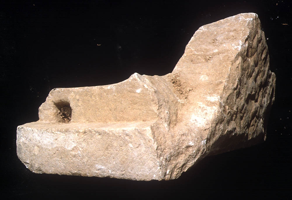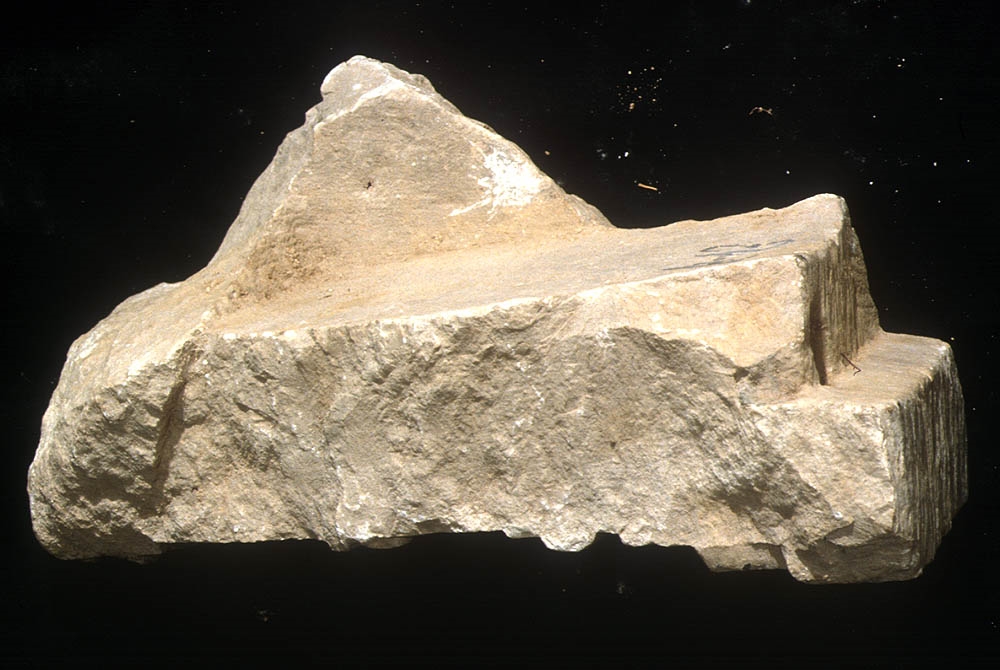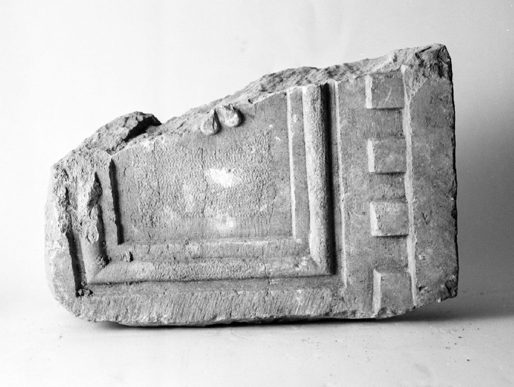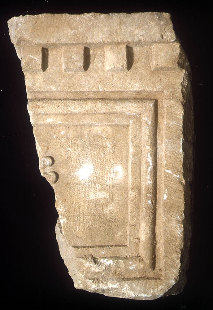 Ulomak kamene ploče na kojem se uz jedan rub proteže traka uz koju su u pravilnim razmacima raspoređeni izbačeni kvadrati. Najveći dio ploče zauzima uokvireni četverokut u čijem se središtu nalazi ostatak cvijeta (sačuvane su dvije latice).