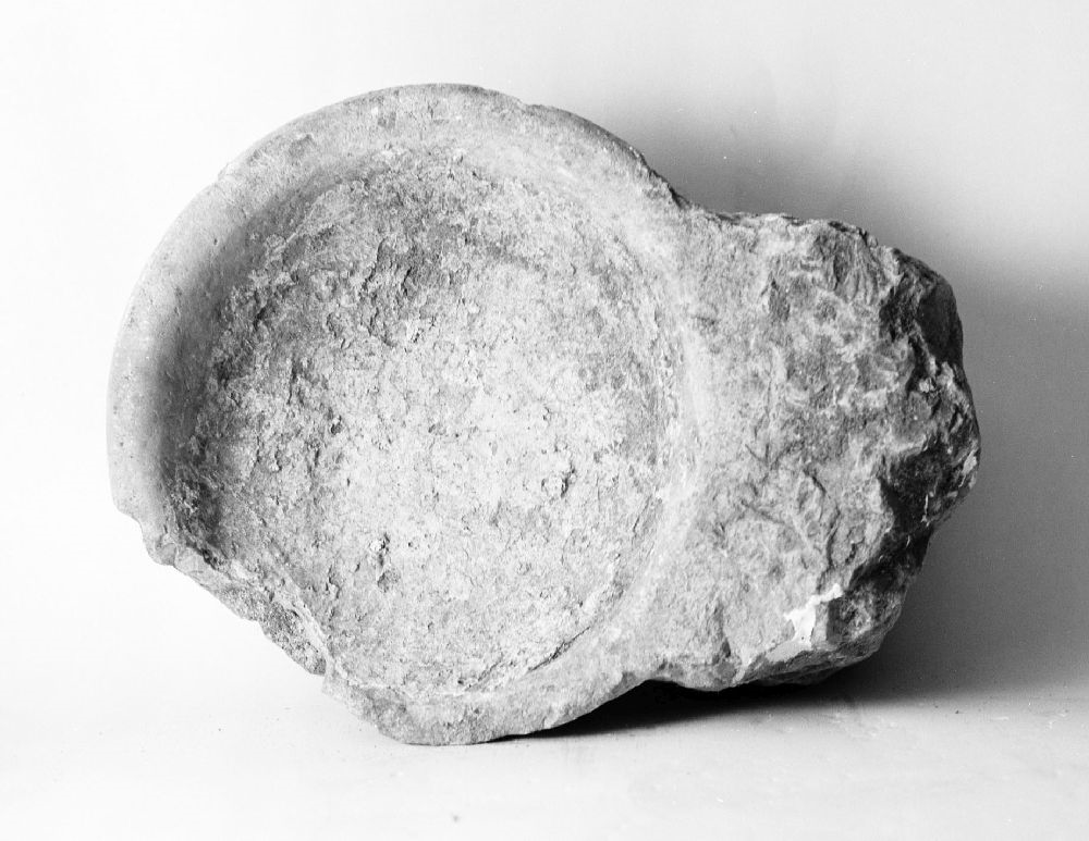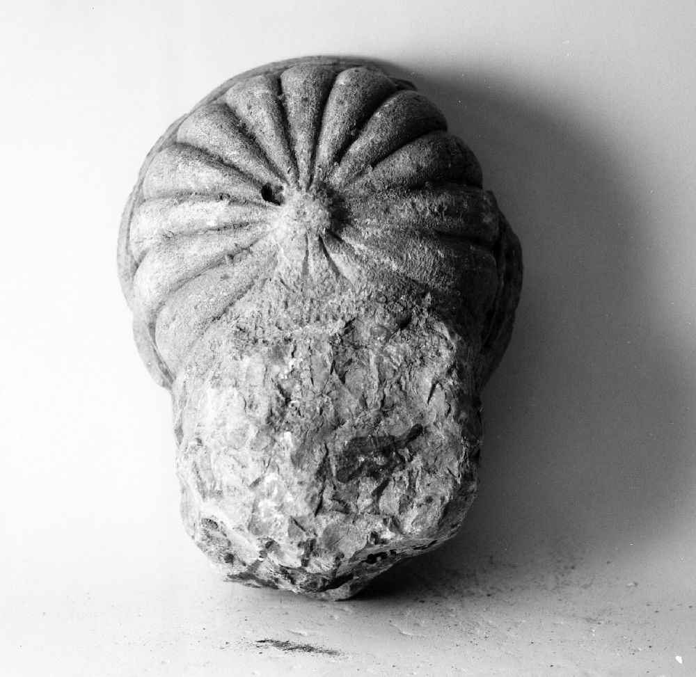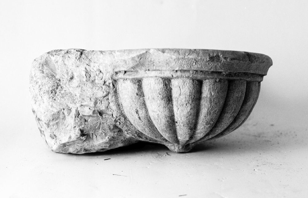 Škropionica prstenastog oboda iz kojeg se spušta 12 oblih traka koje završavaju u bradavičastom ispupčenju na dnu škropionice. Sačuvan je i nastavak kojim je škropionica bila pričvršćena u zid.