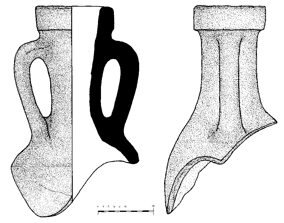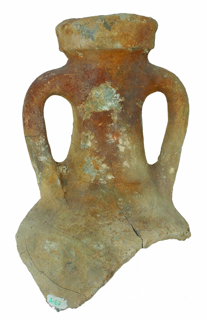 Grlo amfore. Obod je trakasto izveden. Vrat je blago konusan. Ručke su izdužene, okruglog presjeka. Započinju ispod oboda i pod blagim kutom se spuštaju na rame. Nedostaju tijelo i dno/noga.