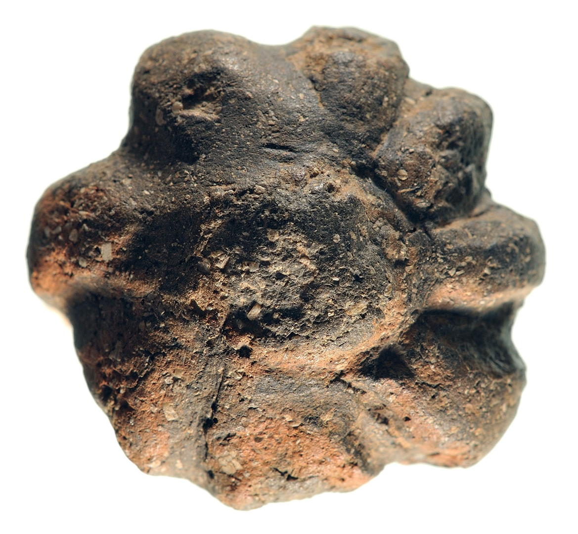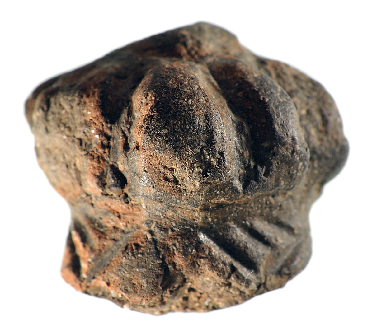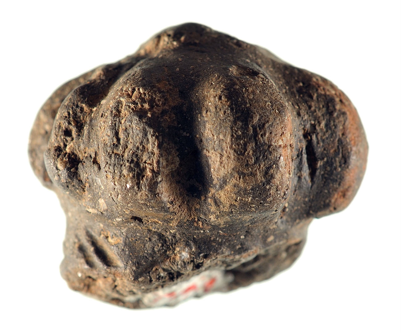 Ulomak gornjeg djela falusoidnog idola na čijem se vrhu nalazi bradavičasto ispupčenje. Odmah uz vrh nalazi se sedam kružno raspoređenih bradavičastih ispupčenja ispod kojih se uočava niz urezanih pravocrtnih geometrijskih motiva u obliku visećih trokuta. Keramika je crvenkasto smeđe boje sa pprimjesama kalcita.