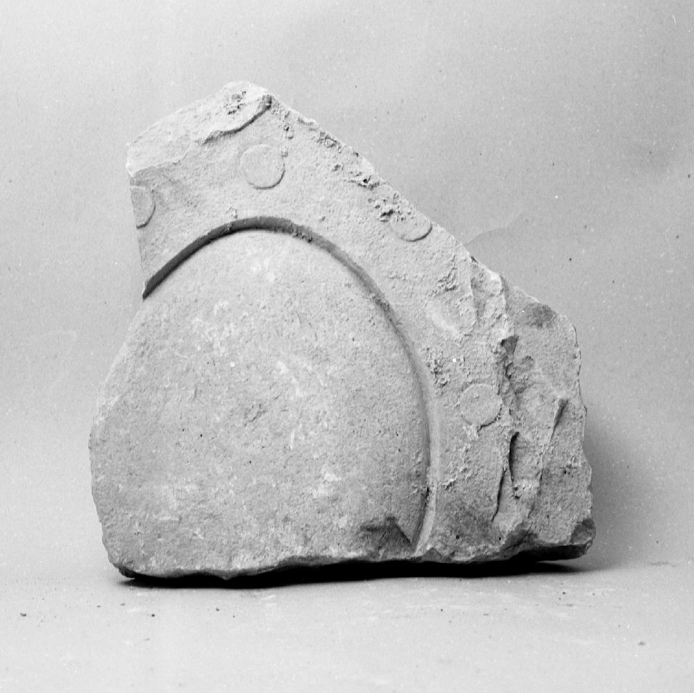 Kamena ploča na kojoj je vidljiv dio štita, čini se jajolikog oblika, uz izostanak bilo kakvog oblika ukrašavanja. Oko centralnog djela u pravilnim su razmacima poredane manje kružnice.