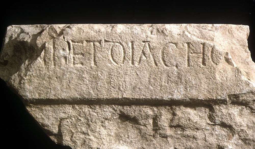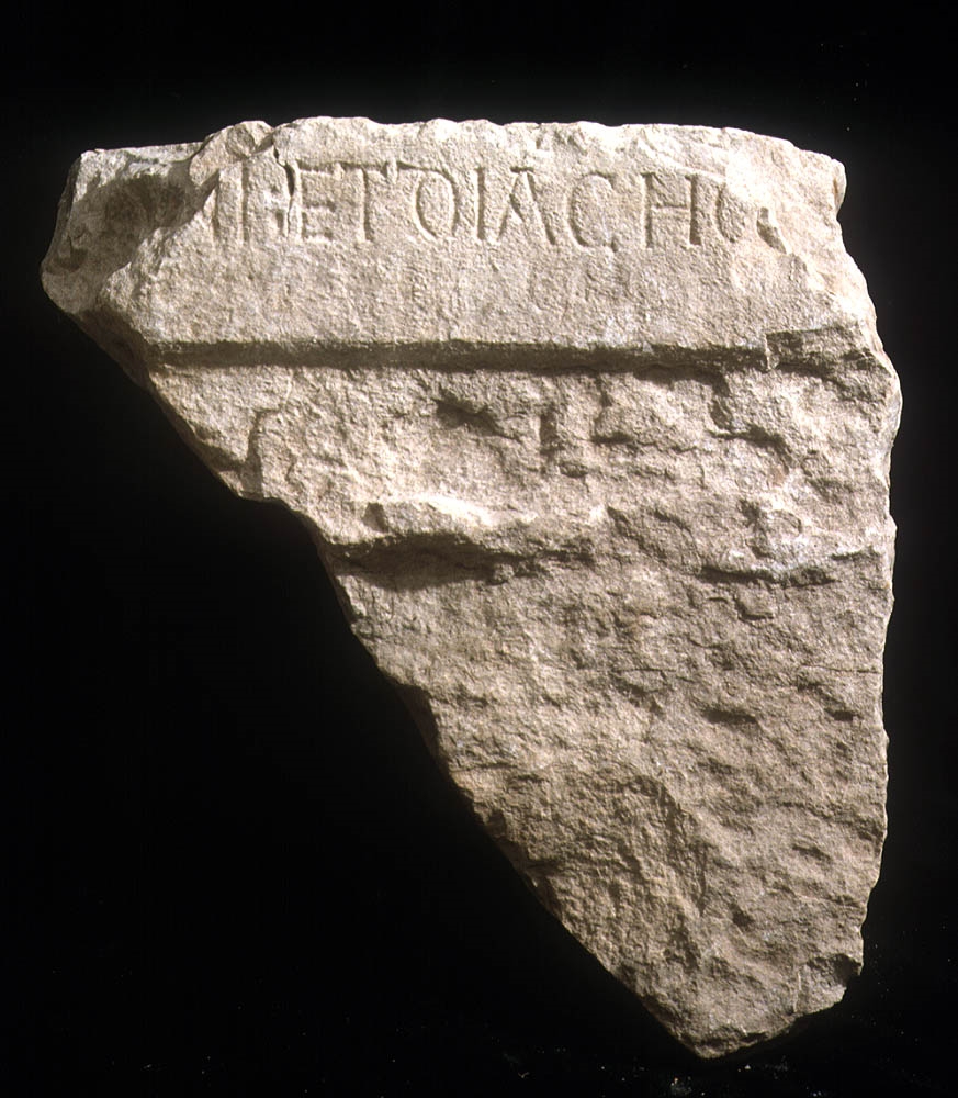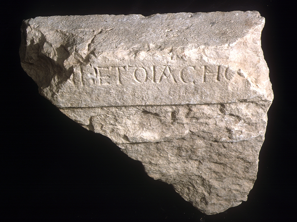 Ulomak kamene ploče trokutastog oblika kojoj je obrađen samo jedna traka uz gornji rub, gdje se i nalazi natpis: I.ET OIACHO