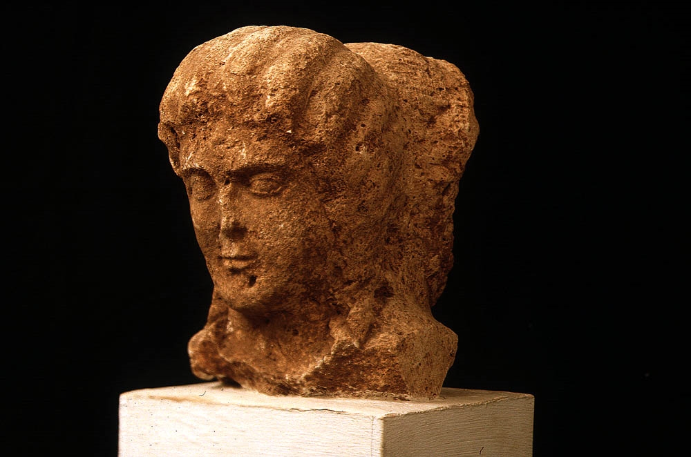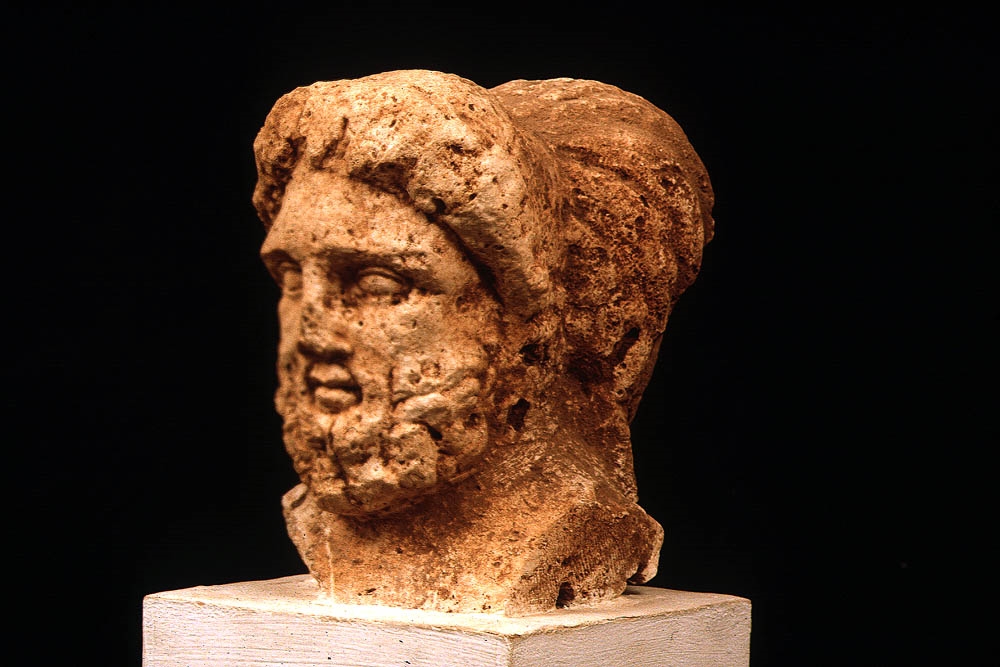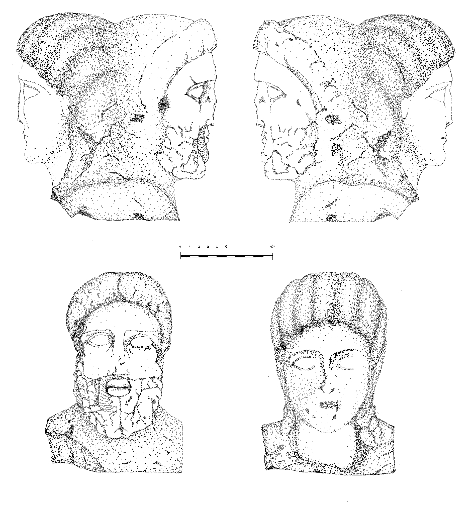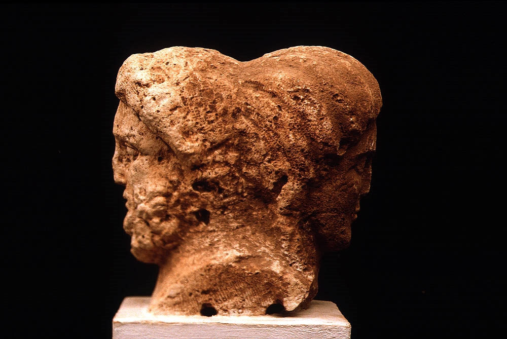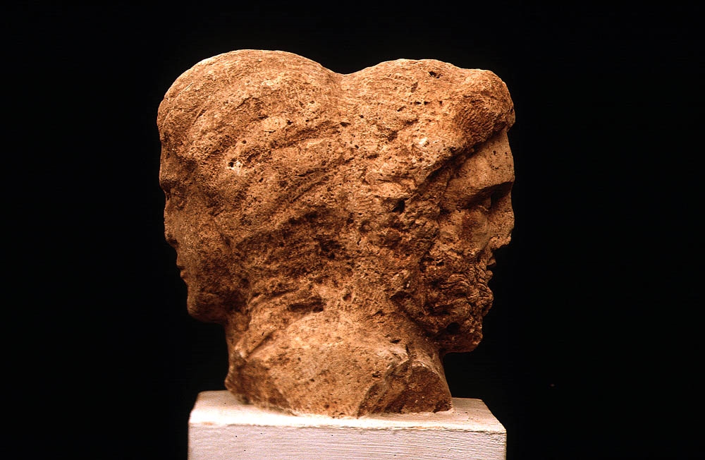 Kamena (vapnenac), klesana skulptura koja se sastoji od dva povezana lica, odnosno dvije glave povezane zatiljkom, s dijelom torza. Jedno lice pripada bradatom muškarcu, a drugo vjerojatno ženi s devet uvojaka u kosi. Donji dio herme ima oblik klina, vjerojatno za uglavljivanje u gornji dio kamenog stupa na koji su herme bile postavljene. Ova tipologija predmeta je služila kao ukras u vrtovima rimskih vila, ali se postavljala i uz ceste i na raskrižjima putova.