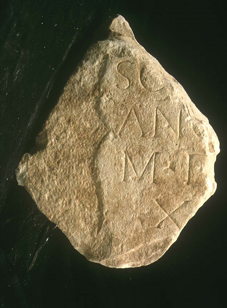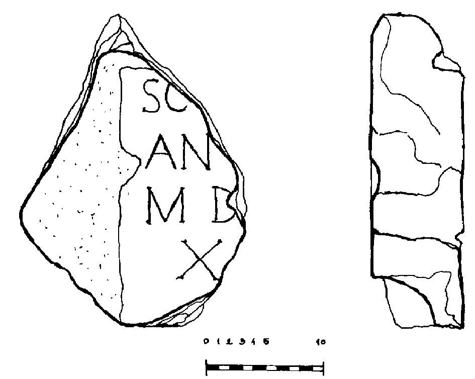 Ulomak kamene ploče. Na obrađenom dijelu vide se početna slova četiriju redova koji tvore natpis:: SC* AN* M.D* X
