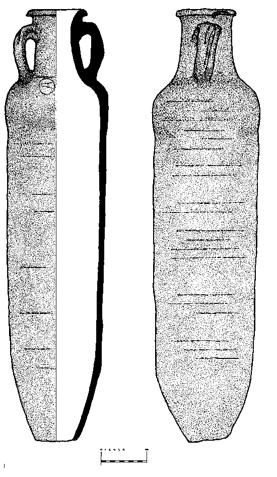 Gotovo u cijelosti sačuvana amfora. Obod je zadebljan i ljevkast izvana. Vrat je blago konusan. Ručke su trakaste i polukružnog presjeka, započinju ispod oboda, a završavaju na ramenu. Tijelo je izduženo i cilindrično te se sužava prema dnu koje nedostaje. Na ramenu se nalazi pečat kojeg tvori slovo A unutar kruga.