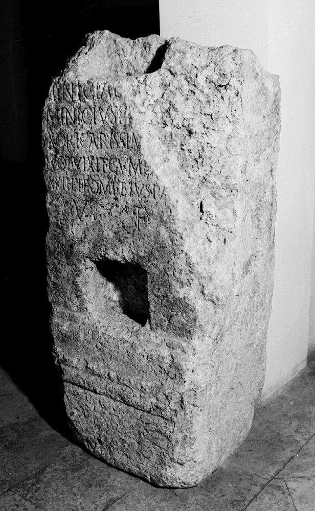 Kameni blok, na kojem se nalazi nadgrobni natpis obitelji Minicija, koji je u primarnom obliku služio kao nadgrobni žrtvenik, da bi kasnije uklesivanjem dvaju četvrtastih udubljenja bio pretvoren u podložak stupova tijeska. Na prednjem djelu bloka nalaze se dva utora, od kojih je donji utor u potpunosti sačuvan (dim. 19x22, dubina 13 cm) dok je gornji gdje se nalazio vrh žrtvenika oštećen. Između dva utora nalazi se natpis koji je u gornjem desnom kutu oštećen. Na 44 cm od donjeg ruba nalaze se dvije profilirane letvice. Natpis glasi: (...) MINICIAE (...) MINICIVS TI(...U) XORI CARISSIM(AE, ---Q?)UOI(?) VIXIT CVM EA (ANNOS) XXII ET POMPEIVS PA(TER) V(IVI) F(ECERUNT). Natpis je bio posvećen preminuloj Miniciji, a postavili su ga njezin suprug Minicij i otac Pompej.