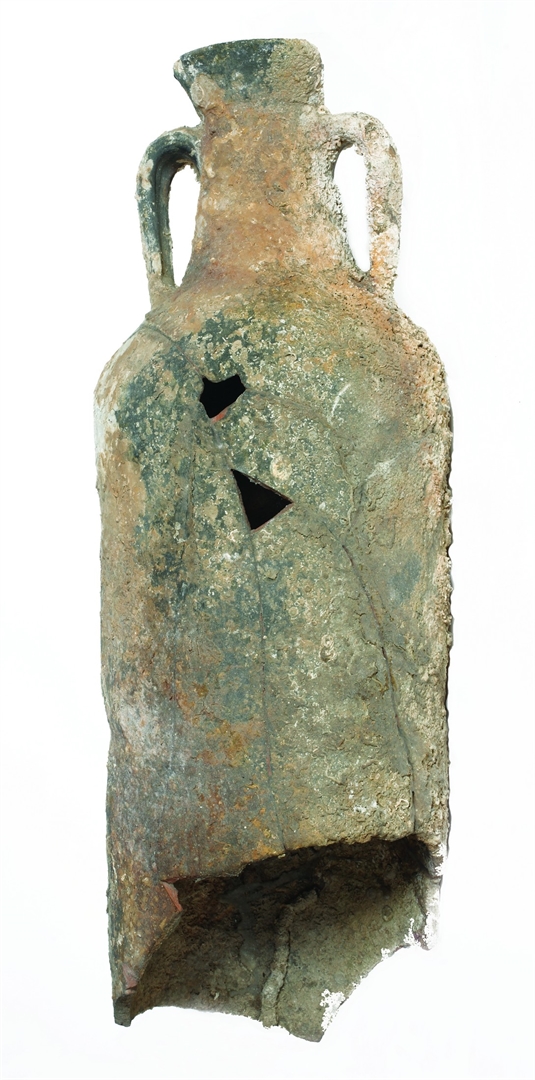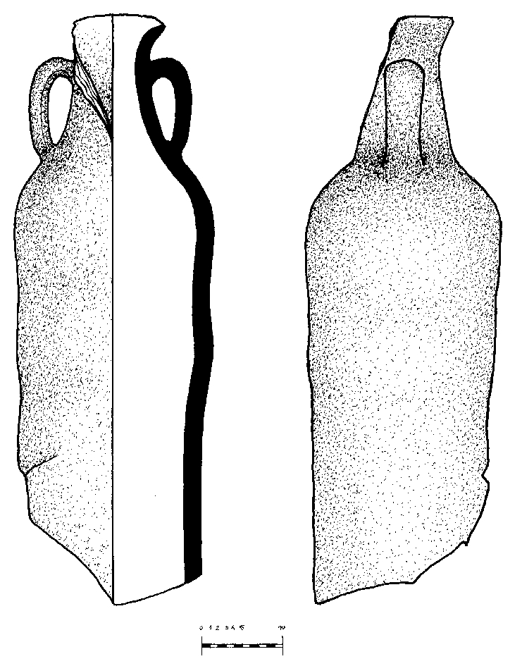 Gotovo u cijelosti sačuvana amfora, ljevkastog i naglašenog oboda. Vrat je konusan. Ručke imaju zaobljene vrhove, i sa vrha se spuštaju na rame. Tijelo je izduženo i cilindrično te se sužava prema dnu. Nedostaju dio oboda, donji dio tijela i dno.