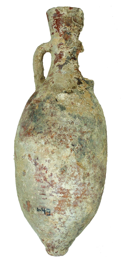 Gotovo u cijelosti sačuvana amfora ljevkastog oboda sa plitko urezanom linijom koja teče ispod oboda. Vrat je konusan. Ručka je manja i okruglog presjeka. Započinje na vratu, a završava na ramenu. Tijelo je jajoliko i završava pupčastom nožicom. Jedna ručka nedostaje.