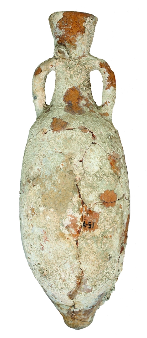 Cjelovito sačuvana amfora ljevkastog oboda sa plitko urezanom linijom koja teče ispod oboda. Vrat je konusan. Ručke su okruglog presjeka, započinju na vratu a završavaju na ramenu. Tijelo je jajoliko i završava pupčastom nožicom.