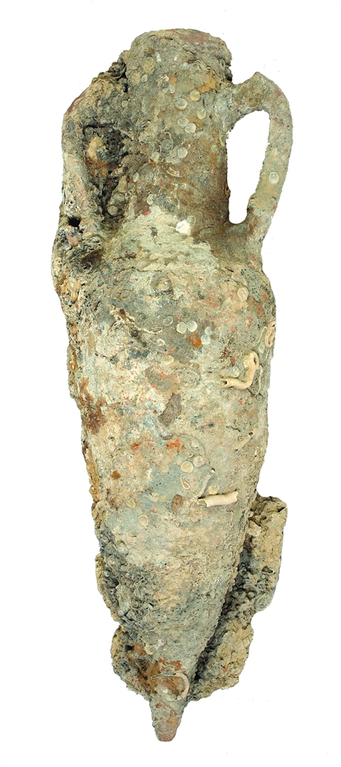 Cjelovito sačuvana amfora blago zadebljanog/prstenastog oboda i izduženog cilindričnog vrata. Ručke su okruglog presjeka, ukrašene rogolikim izdankom na vrhu. Započinju ispod oboda i polukružno se spajaju na rame. Tijelo je konično, sa vodoravnim kanelurama, i završava sužavanjem u kratku šiljastu nogu. Dio tijela prekriven je inkrustacijom.