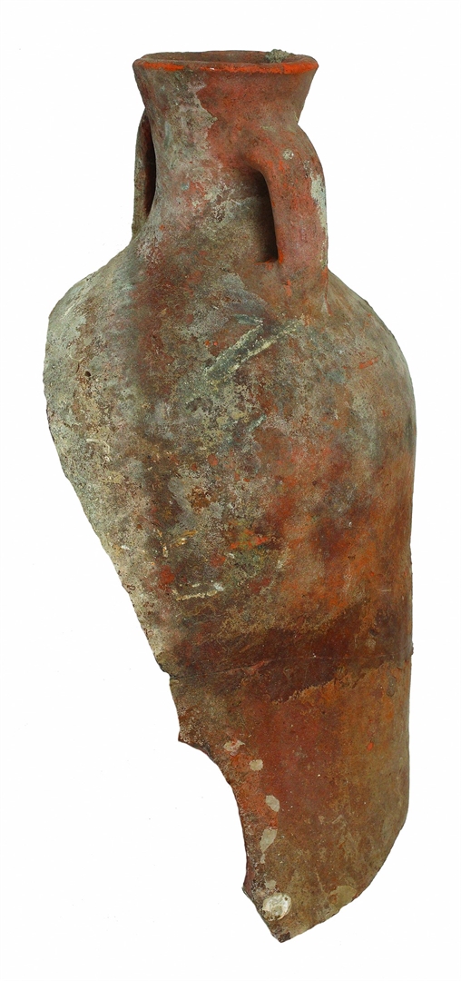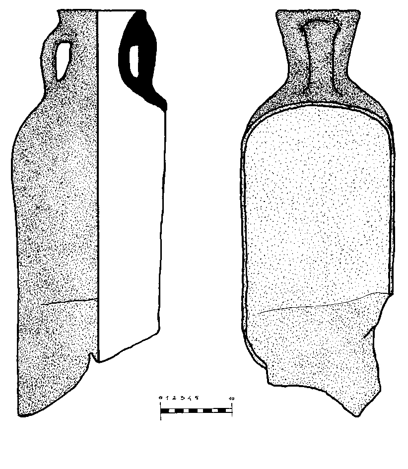 Gotovo u cijelosti sačuvana amfora. Obod je ljevkast i blago naglašena ruba. Vrat je kratak, konusan/cilindričan. Ručke su male, zadebljane i brazdane. Započinju ispod oboda i završavaju na ramenu. Ručke su asimetrične; jedna je viša od druge. Tijelo je cilindrično: Nedostaje veći dio tijela i dno.