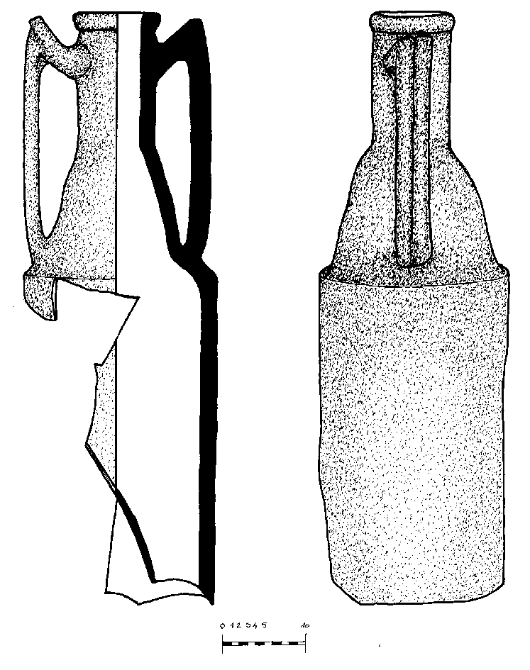 Ulomak amfore. Obod je naglašen i prstenast. Vrat je u gornjoj polovici cilindričan, u donjoj konkavan. Na vratu su bifidne ručke sa šiljasto izdignutim vrhovima, koje se okomito spuštaju na naglašeno rame. Tijelo je izduženo, cilindrično. Nedostaje dio tijela i dno.