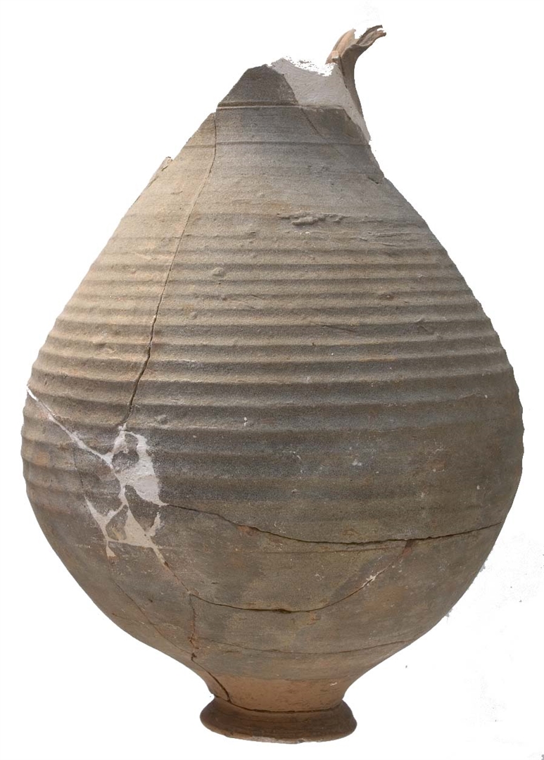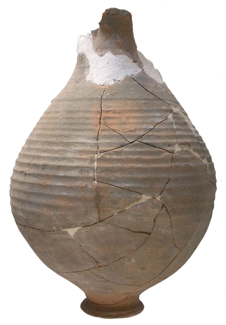 Vrč loptastog, narebranog tijela tankih stijenki sa suženom prstenastom nožicom i kratkom, uspravnom, trakastom ručkomkoja je po sredini uzdužno užlijebljena. Otvor nije sačuvan. Glina je crvena, tvrda, pročišćena. Premaz je djelomice nanesen sa vanjske strane, tako da nožica nije pokrivena; sjajan je i sivozelene boje. S unutrašnje strane premaz je tanak i bez sjaja. Visina 152mm, promjer otvora 82mm, promjer dna 31mm, promjer trbuha 115mm, visina ručke 60mm, debljina stijenki 2mm.