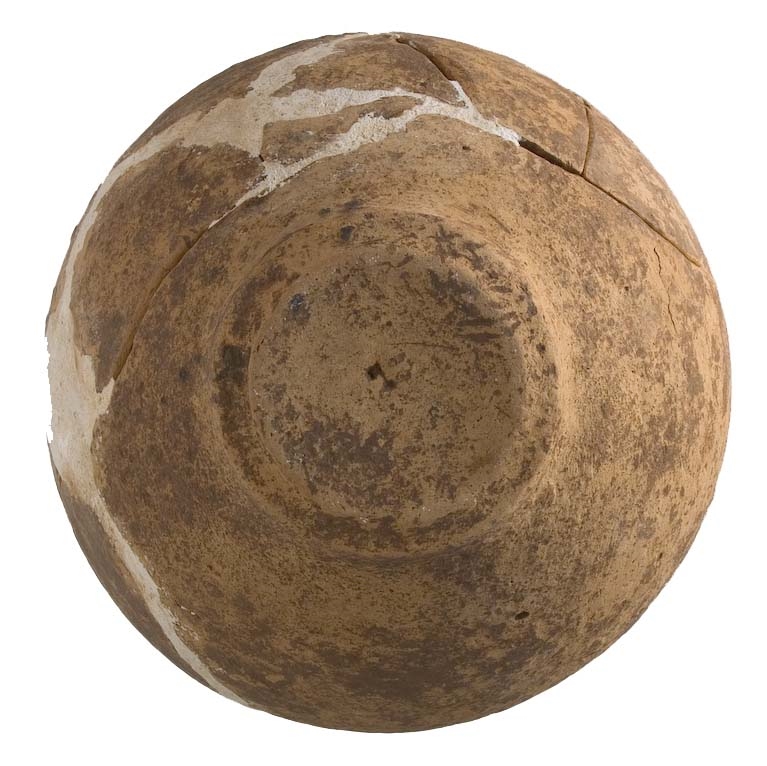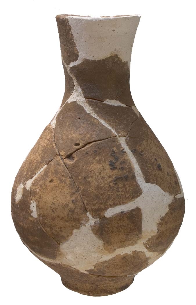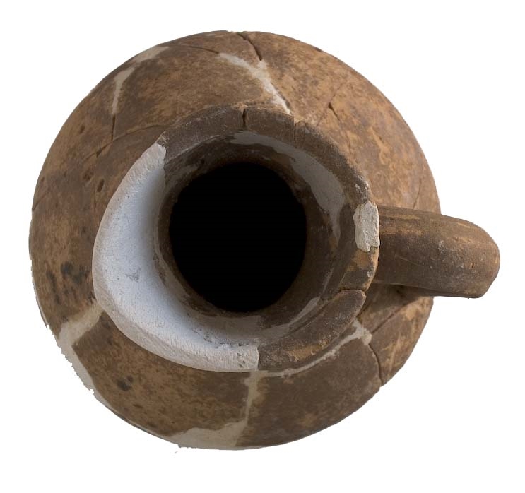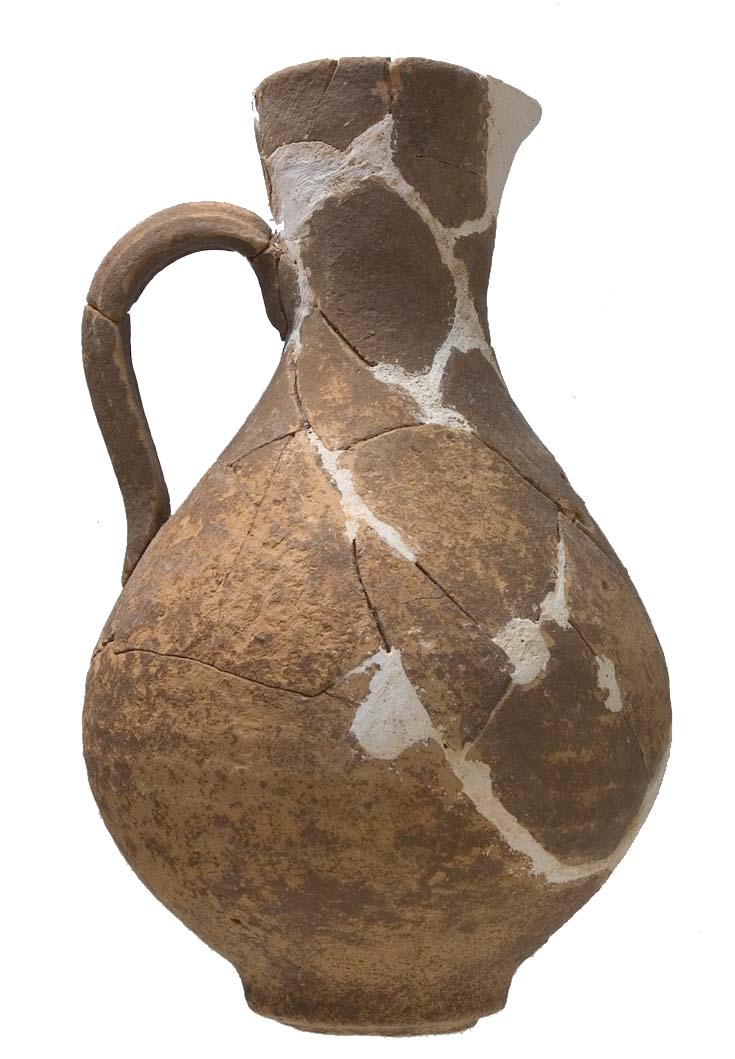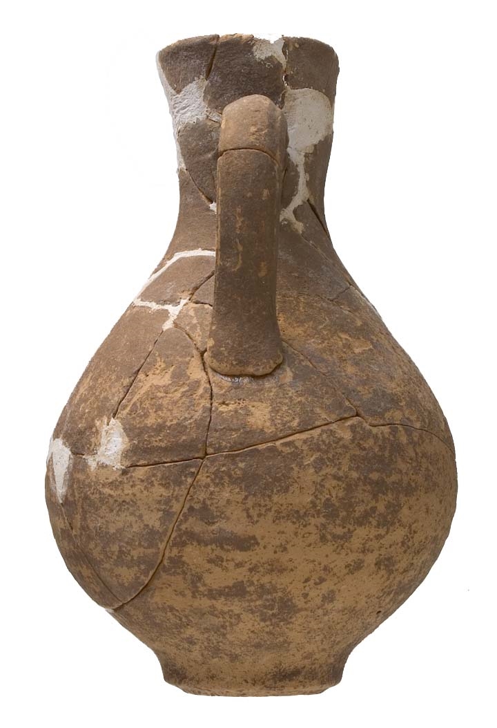 Vrč s izlijevom i trakastom drškomkoja je blago užlijebljena na rubovima. Tijelo ima loptasti oblik, a stijenke su narebrane. Rubovi otvora i dna zakošeni su prema unutra. Glina je žućkastonarančasta, pročišćena, pokrivena smeđom naslagom.