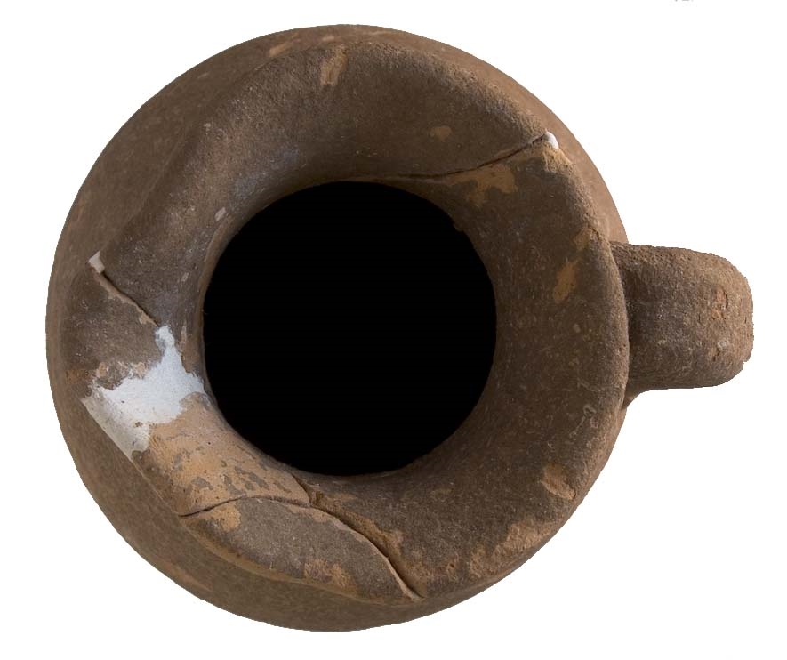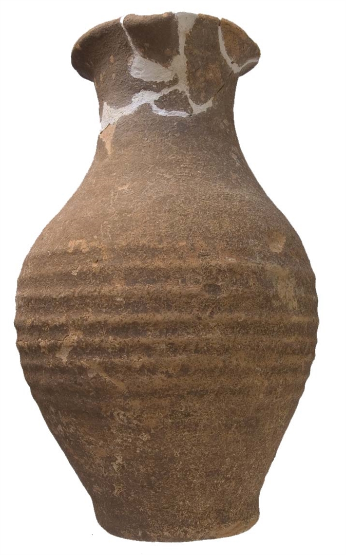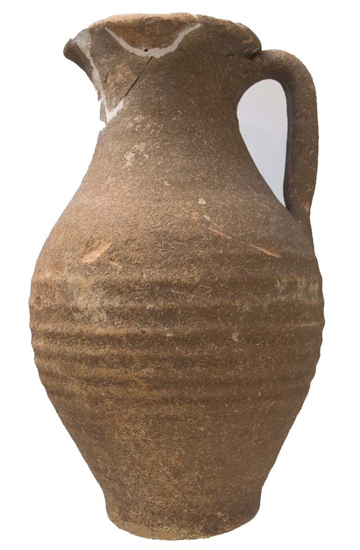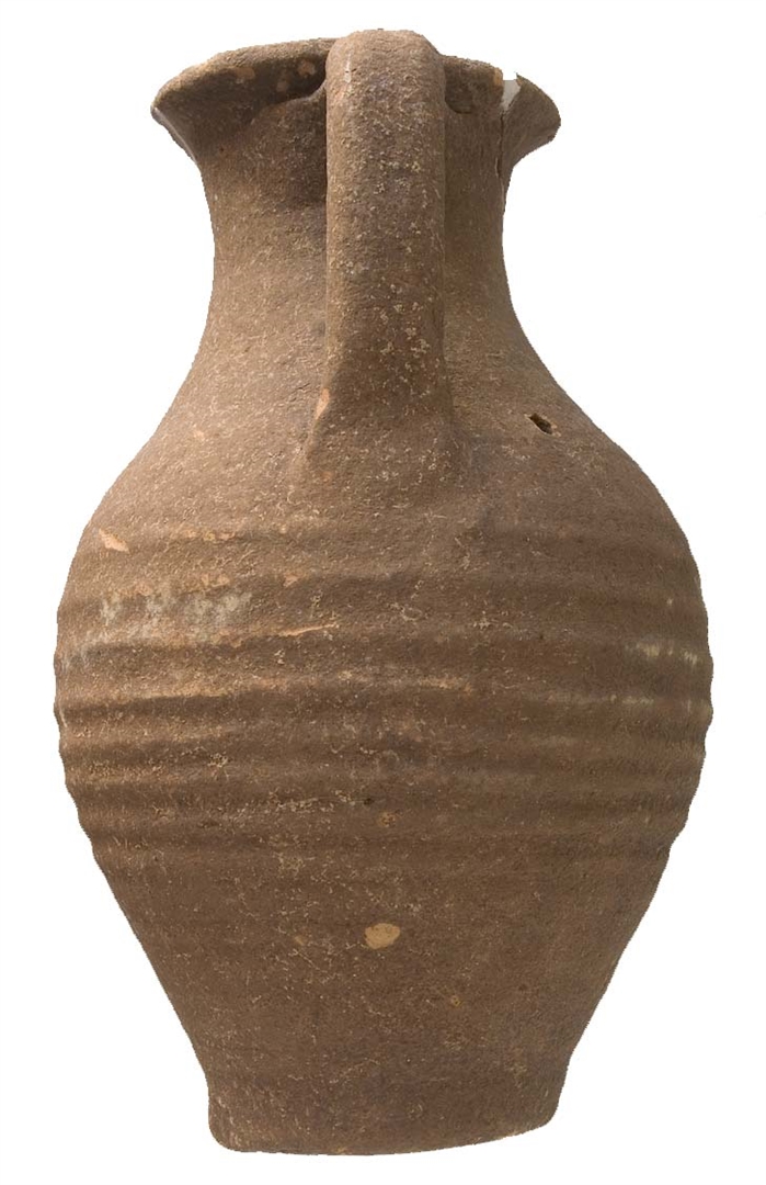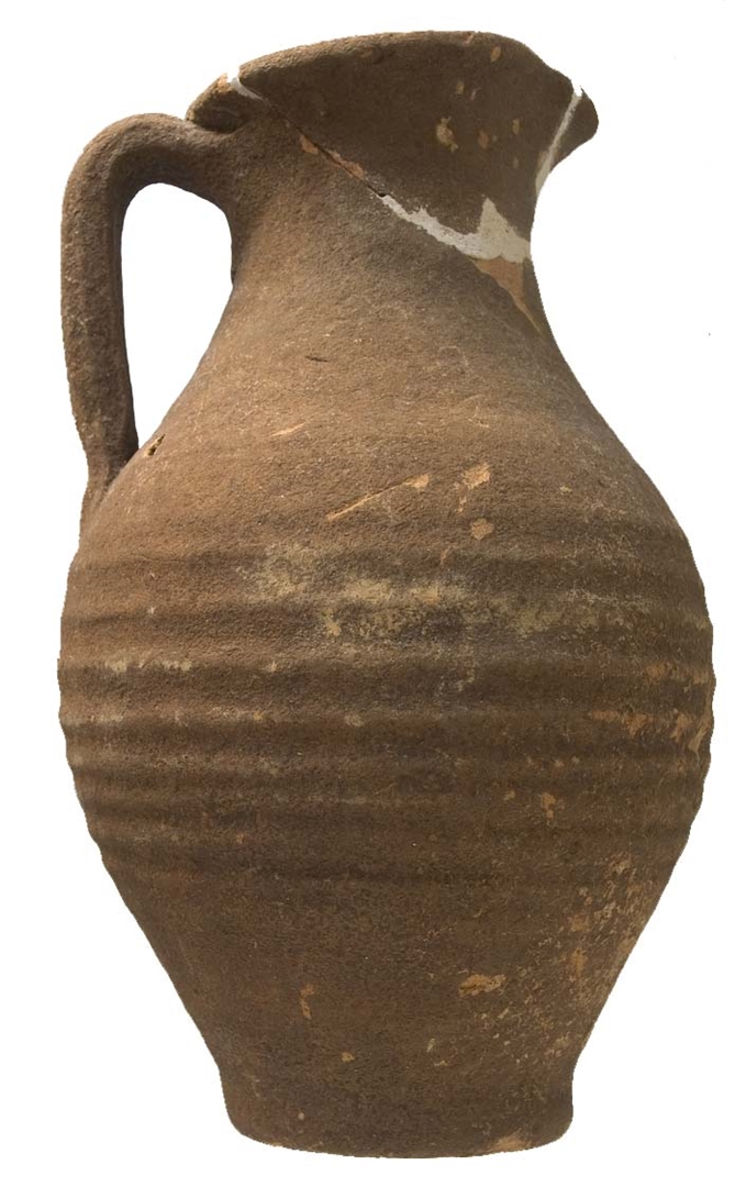 Vrč s izlijevom i trakastom, u sredini užlijebljenom ručkom. Stijenke su narebrane. Glina je narančasta, pročišćena, pokrivena smeđom naslagom. Dimenzije: Visina 200 mm, promjer otvora 82 mm, promjer dna 62 mm, promjer trbuha 130 mm, visina ručke 80 mm, debljina stijenki 6 mm.