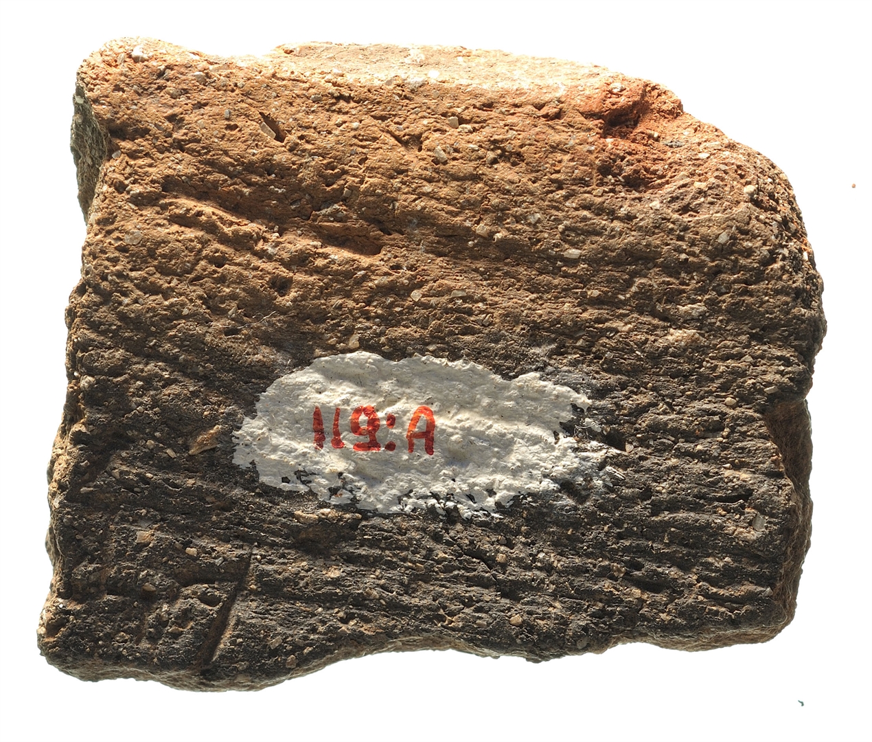 Ulomak posude na kojem se uočava ravni i nenaglašeni obod ispod kojeg se spušta prema unutrazakošen trbuh. Na vanjskoj strani nalazi se plitki metličasti ukras, dok ga sa unutrašnje strane nema. Keramika je grube izrade s puno primjesa kalcita, i crvenkaste je boje.