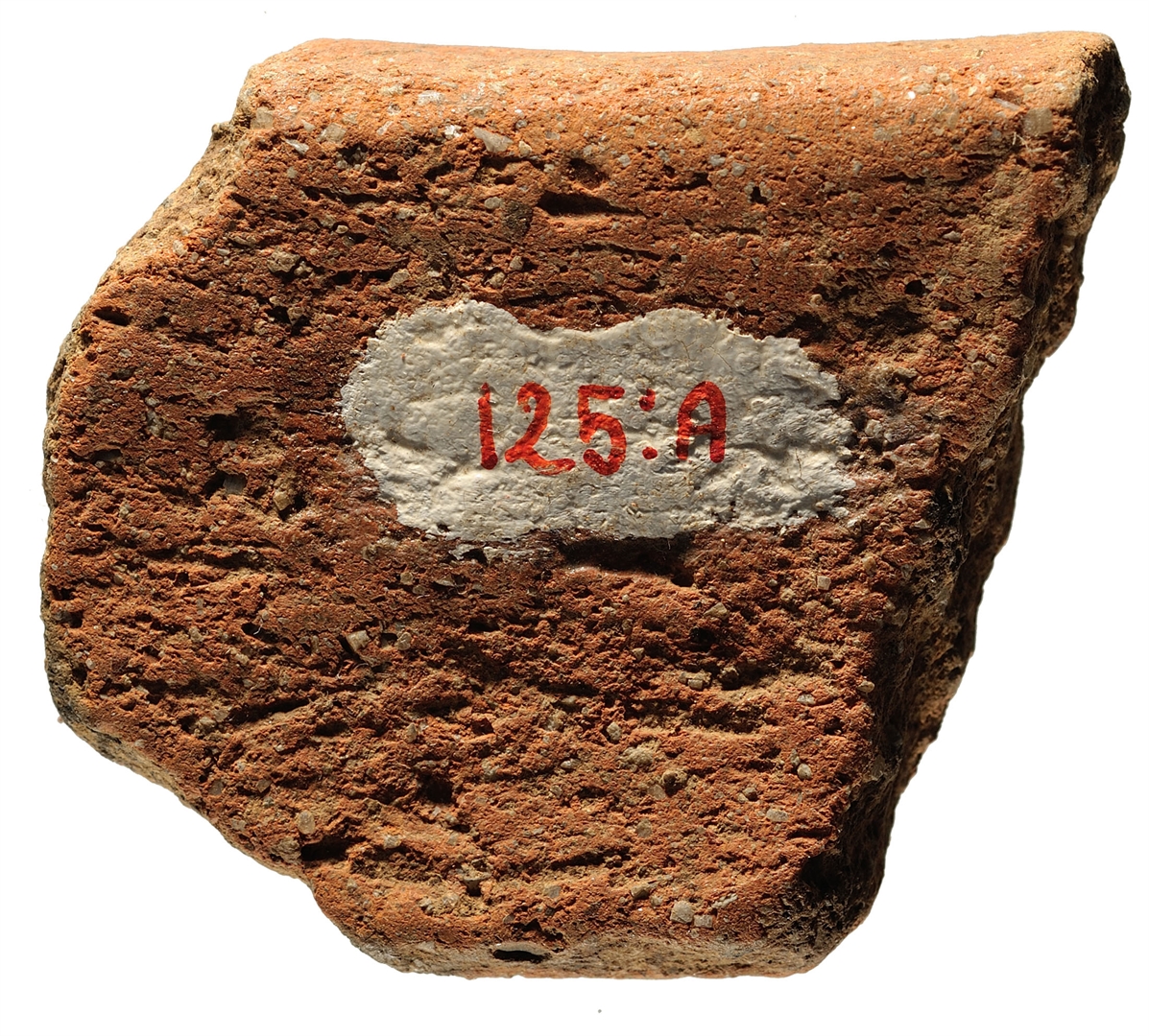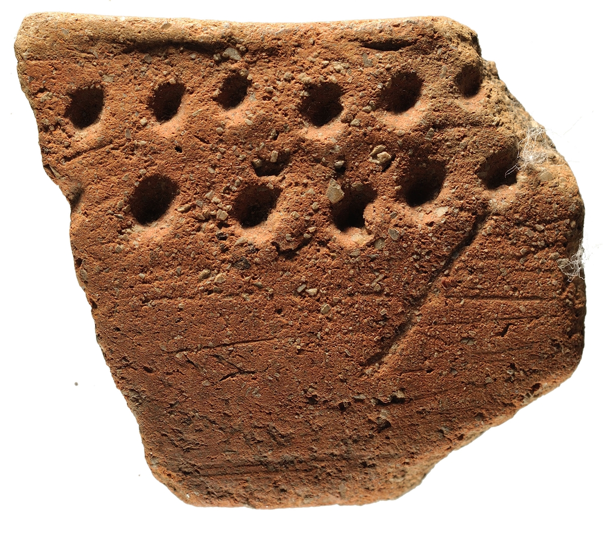 Ulomak posude ravnog oboda ispod kojeg se sa vanjske strane nalaze ukrašen s dva reda uboda. Ispod oboda spušta se prema unutra zakošen trbuh. Keramika je crvenkaste boje sa dosta kamenčića.