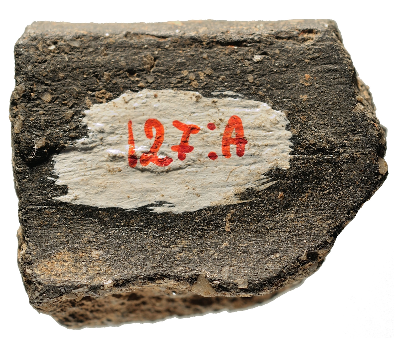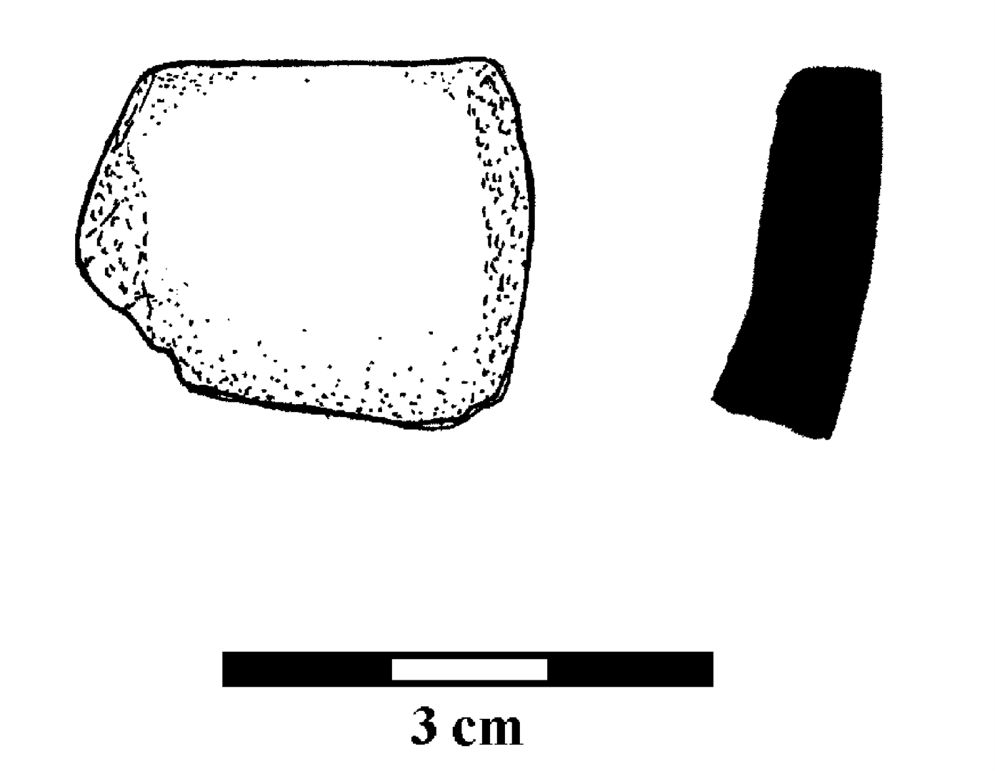 Ulomak posude ravnog oboda ispod kojeg se spušta prema unutra zakošen trbuh. Keramika je crne boje sa dosta primjesa kalcita.