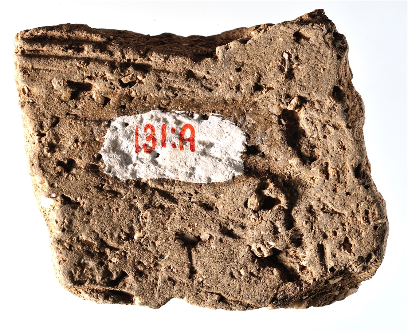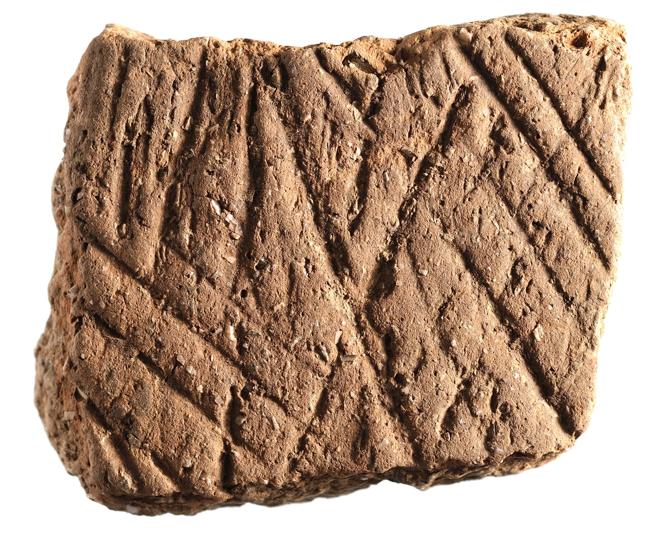 Ulomak trbuha posude crvenkaste boje koji je sa vanjske strane ukrašen metličastim ukrasom.
