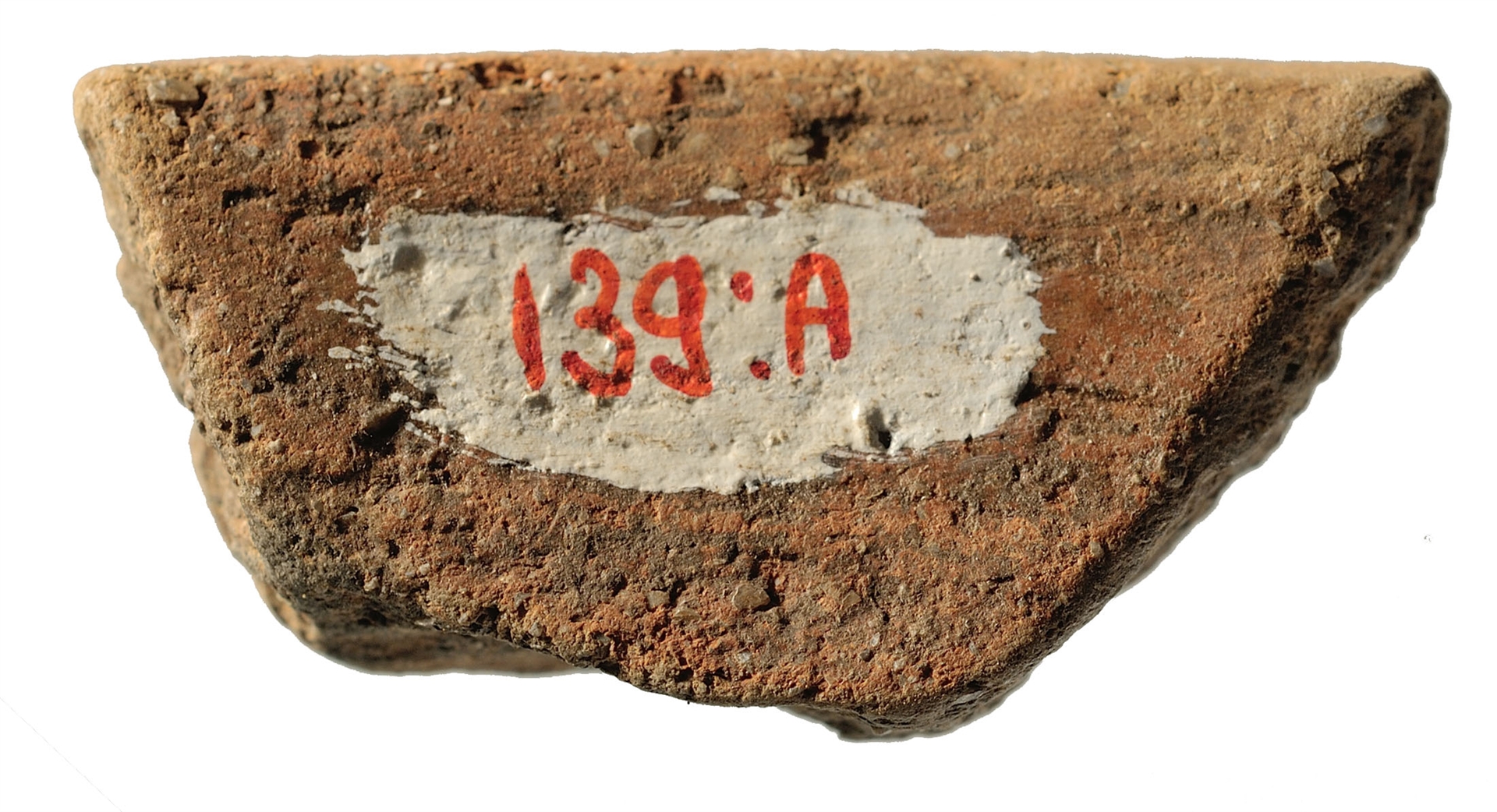 Ulomak posude polukružno zaobljenog oboda. Keramika je crvenkaste boje sa primjesama kalcita.