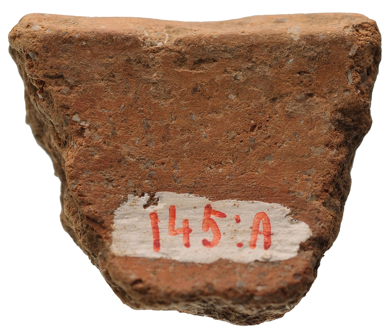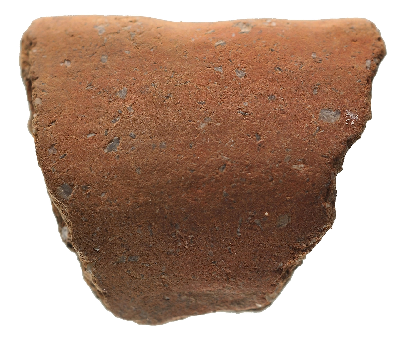 Ulomak posude sa zaobljenim obodom ispod se spušta isti takav trbuh. Keramika je crvenkaste boje sa primjesama kalcita.