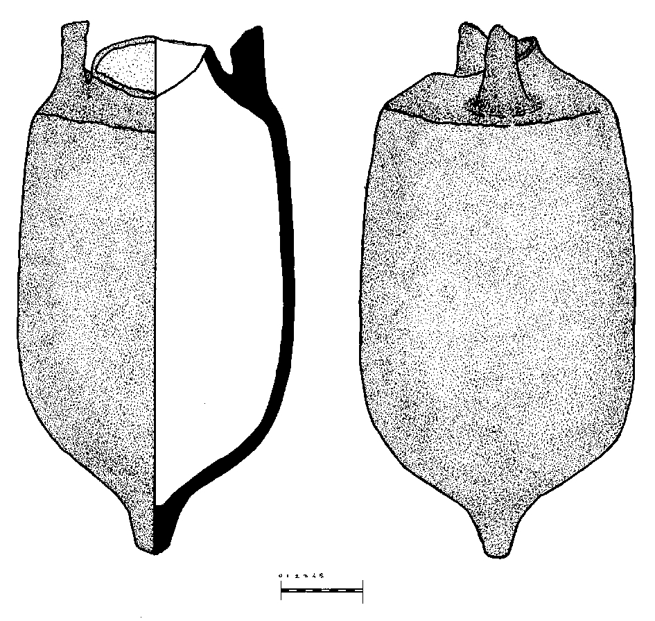 Amfora kojoj nedostaje grlo. Na ramenu se nalaze ostaci vrata i donji dijelovi ručki na naglašenom ramenu. Tijelo je jajolikog, blago prošireno prema dnu i završava šiljatim dnom.