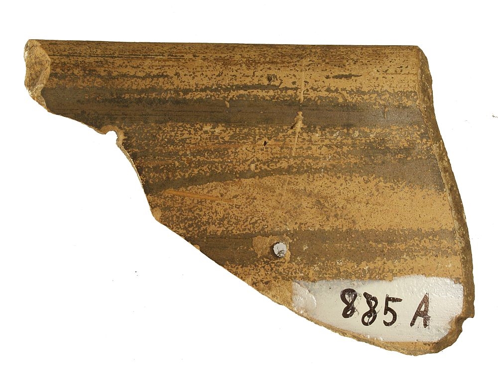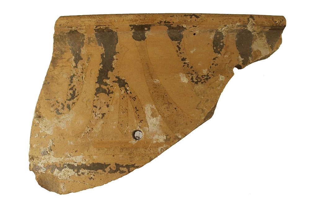 Ulomak ovalnog tijela skyphpsa s lagano izvijenim rubom ušća.Ružićasta pročišćena keramika. Oslikana smeđim tonovima motiv visećih girlandi i hotizontalne crte, iznutra horizontalni premazi smeđom.