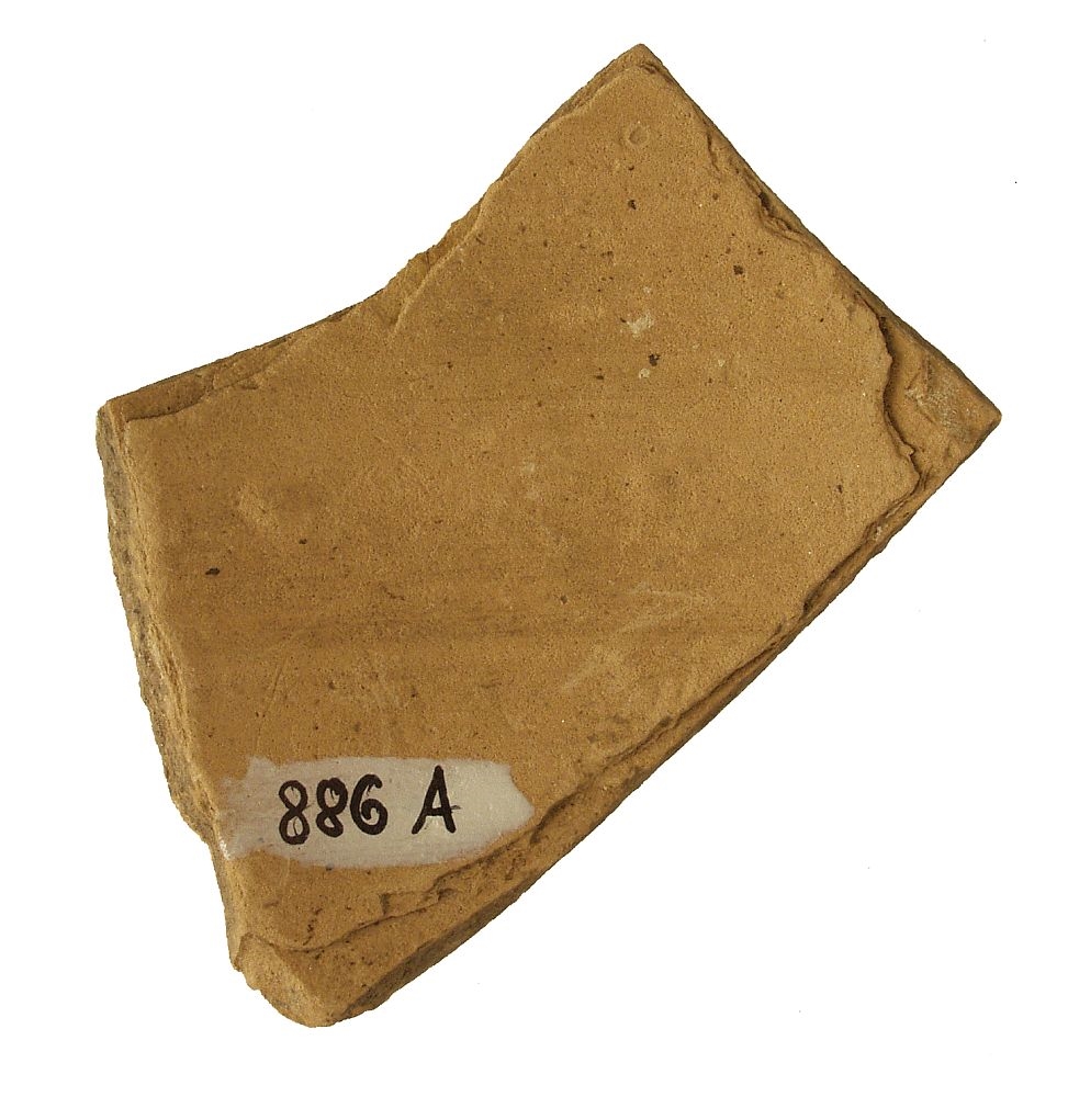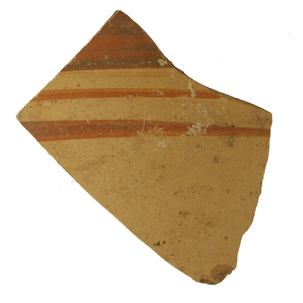 Ulomak tijela posude izrađene na kolu. Svijetlosmeđa pročišćena keramika, ukrašena slikanim oker i smeđim horizontalnim trakama.