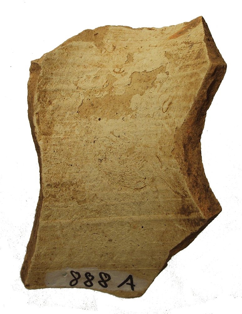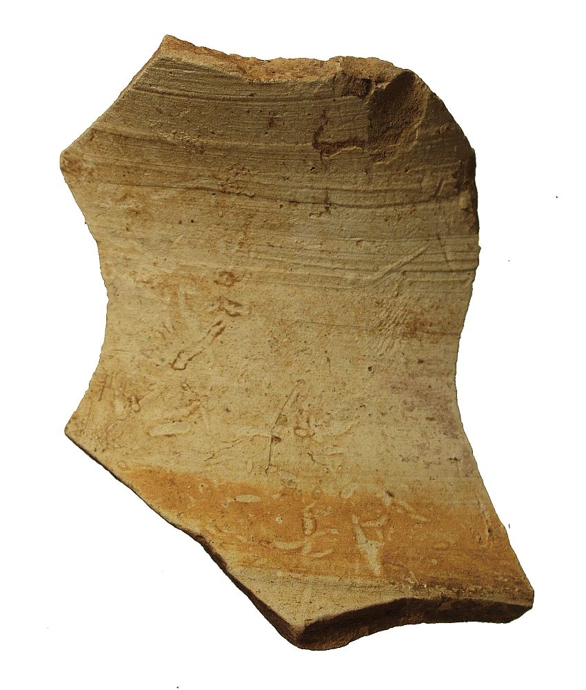 Ulomak visokog suženog vrata vrča izrađenog na kolu. Ružičasto pečena keramika, svijetložućkasti premaz, ukrašena slikanom žutom horizontalnom trakom.