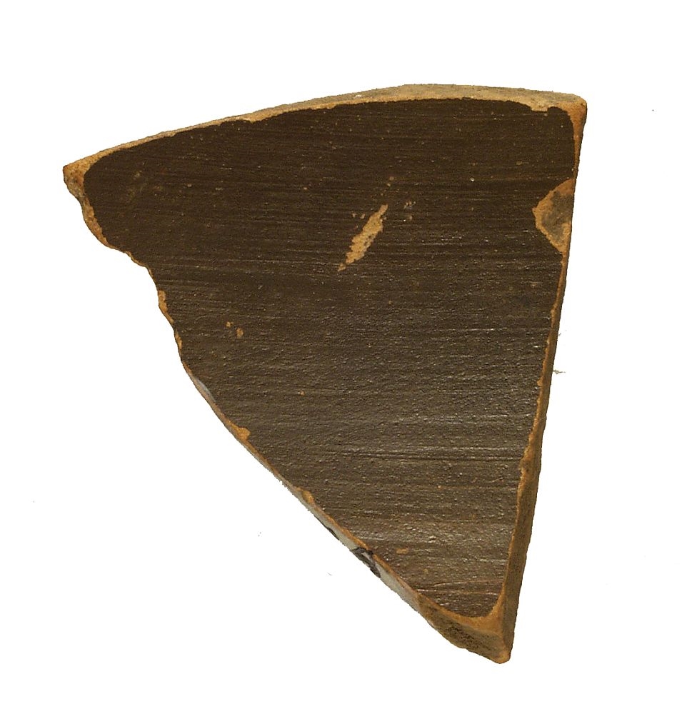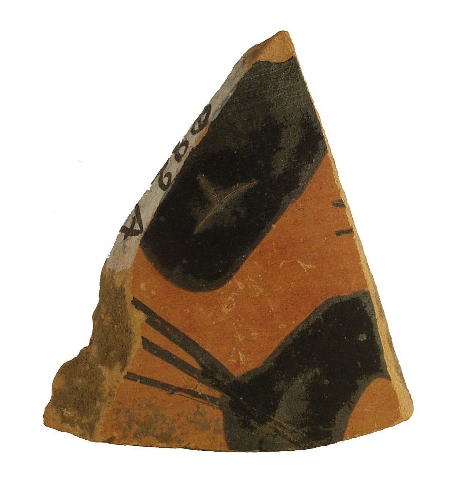 Ulomak crvenofiguralnog skyphosa. Crveno pečena pročišćena keramika izrađena na kolu. Sačuvan je prikaz dijela toge iz koje u desno izlazi ruka.