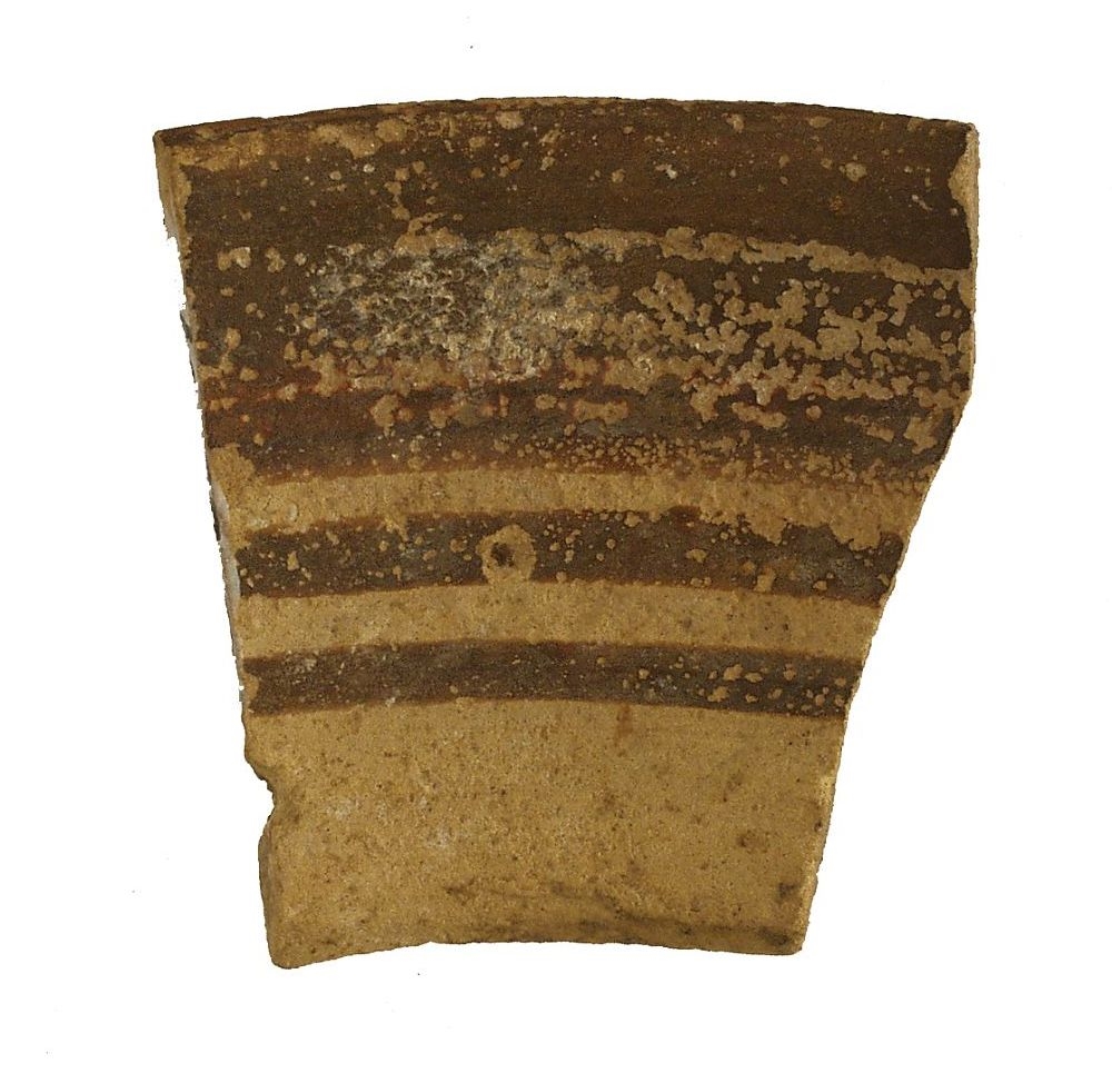 Ulomak ušća vrča izrađenog na kolu. Svijetlosmeđa pročišćena keramika, ukrašena slikanom širokom trakom i parom crta na unutrašnjoj strani ušća i jednom trakom na vanjskoj strani. Sačuvan dio probijene rupice za krpanje posude.