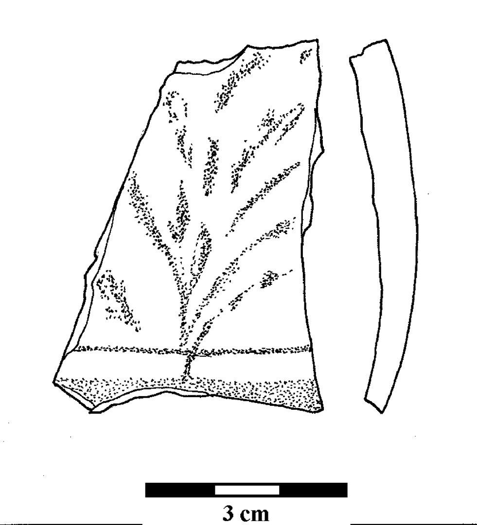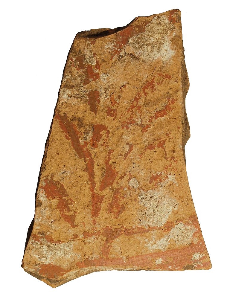 Ulomak tijela posude (amfora?) izrađene na kolu. Crveno pečena pročišćena keramika, ukrašena slikanom crvenom stiliziranom palmetom iznad horizontalne crte i trake.