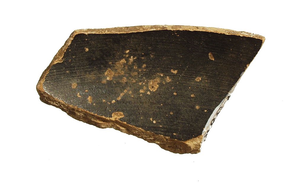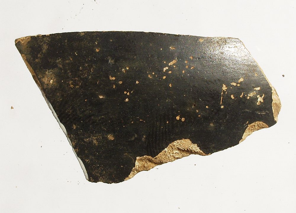Ulomak tijela posude premazane crnim firnisom s obje strane. Svijetložućkasta pročišćena keramika.