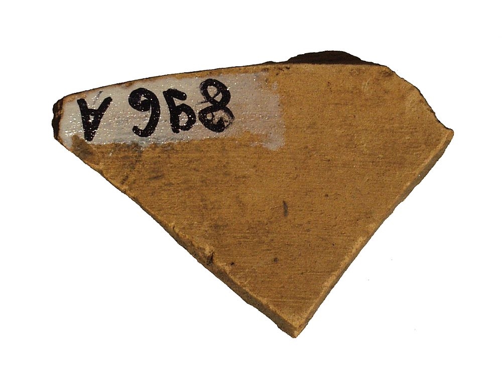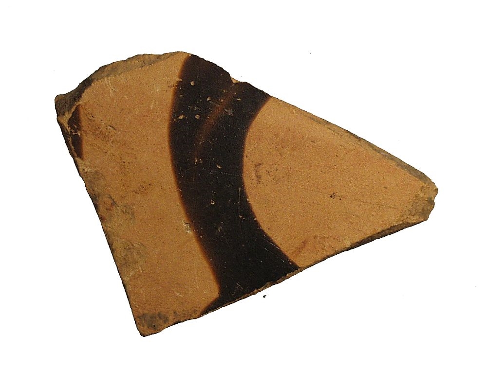 Ulomak crvenofiguralne posude. Narančasta pročišćena keramika. Ostatak neodređenog figuralnog detalja, crni firnis.