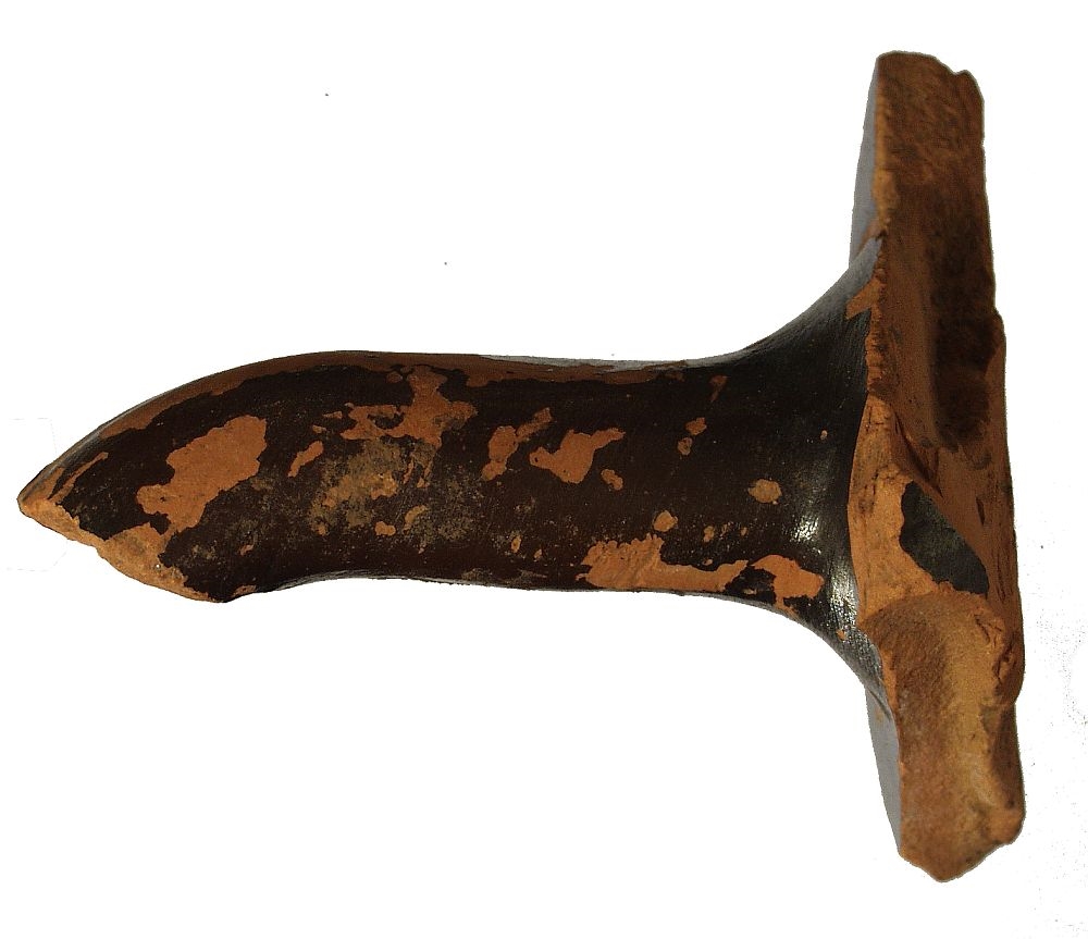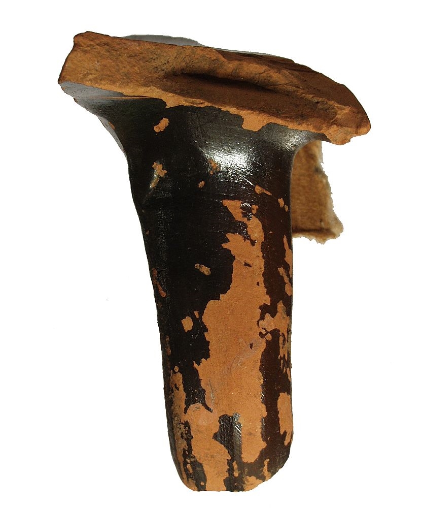 Ulomak ušća skyphosa s dijelom horizontalne ručke ovalnog presjeka. Crveno pečena pročišćena keramika. Premazano crnim firnisom.