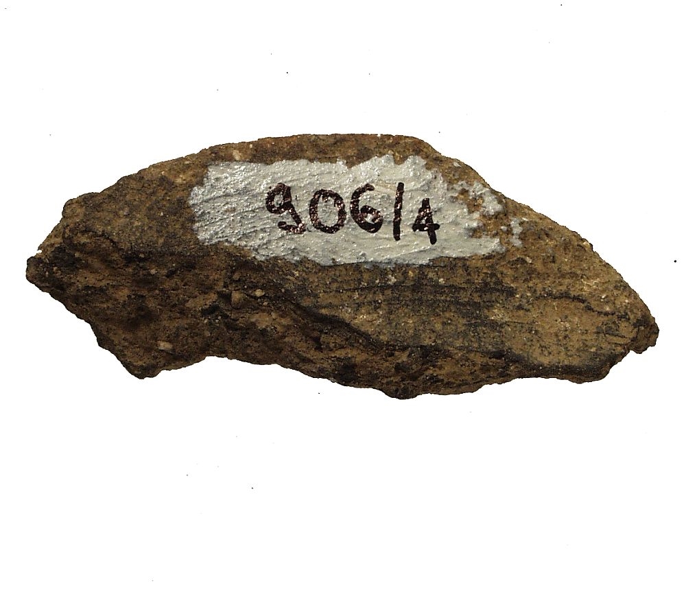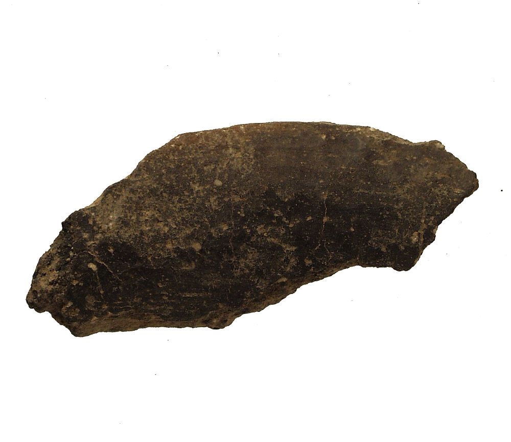 Ulomak prema van izbačenog ušća posude. Keramika je crne boje i sa primjesama kalcita.