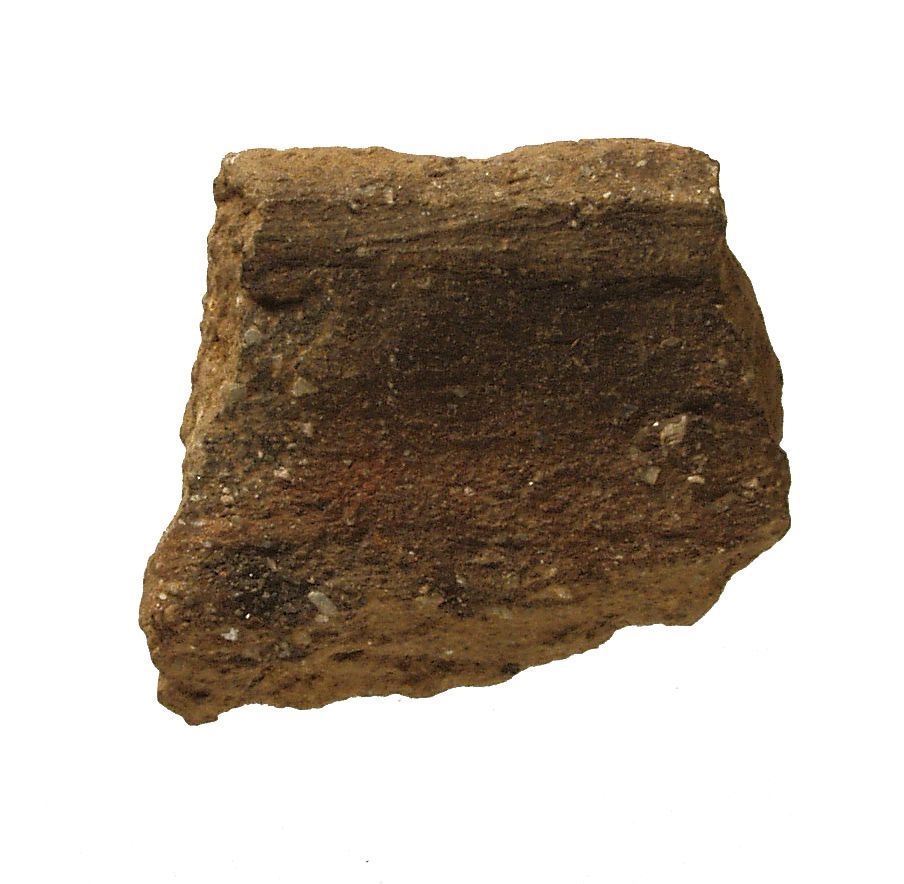 Ulomak prema vani izbačenog ušća posude. Keramika je sivosmeđe boje sa dosta primjesa kalcita.