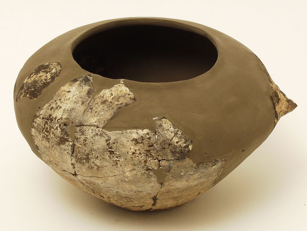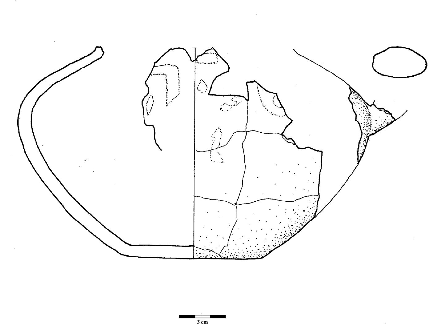 Fragmentirani ostaci trbušaste posude s koničnim donjim djelom i uskim ravnim dnom. Na ramenu nalazi se korjen ručke elipsastog presjeka, a po tijelu se uočavaju ostaci bijelog slikanja u obliku tekuće spirale.