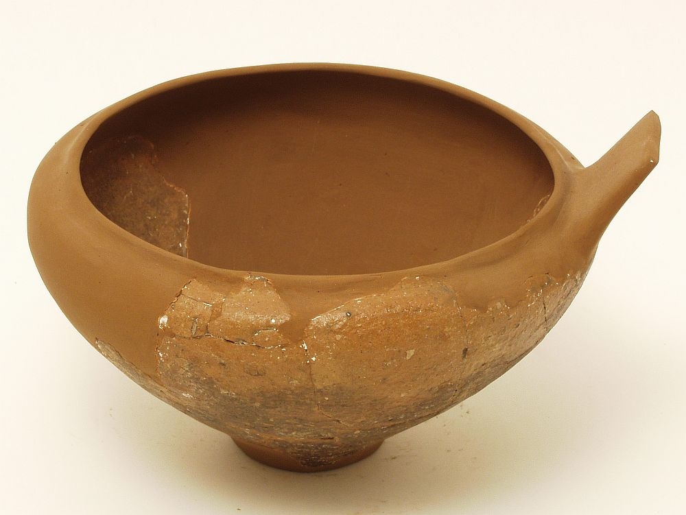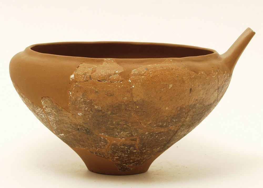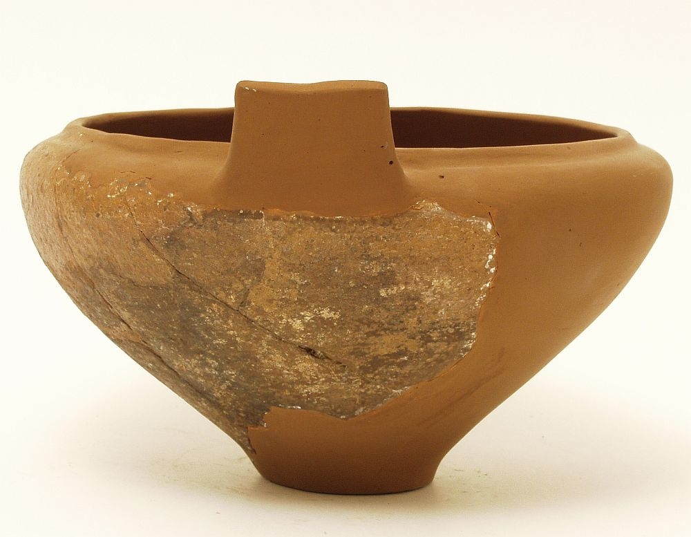 Posuda zaobljenog ramena ispod kojeg se spušta konični trbuh. Keramika je smeđe polirana i na njoj se uočavaju ostaci bijelog slikanja.