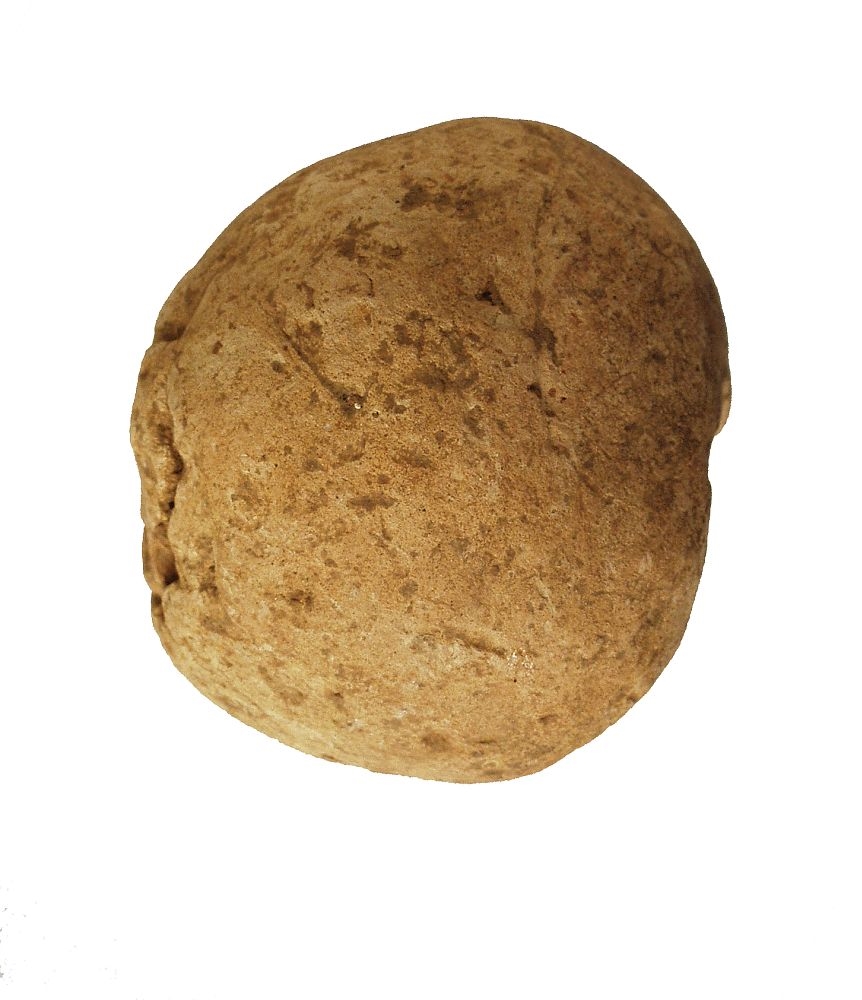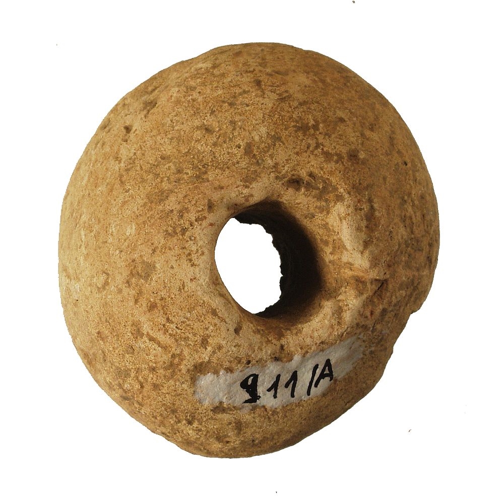 Keramički uteg kuglastog oblika s cilindričnom rupom u sredini. Keramika je svijetlosmeđe boje.