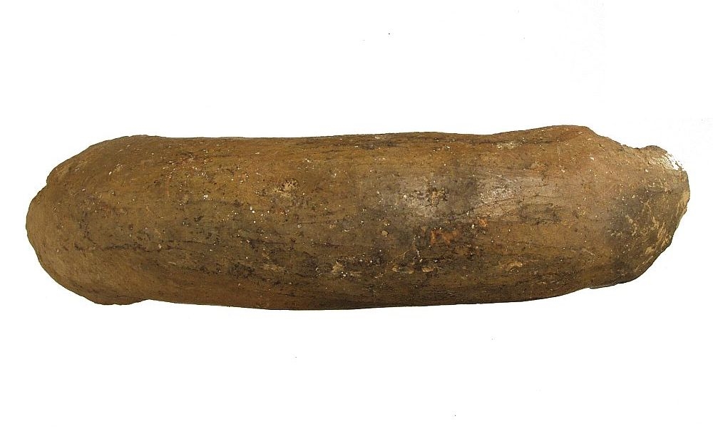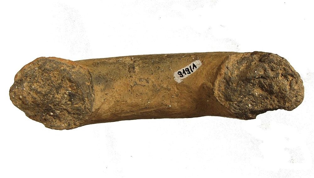 Ulomak zaobljene horizontalne ručka kružnog presjeka. Keramika je smeđesive boje.