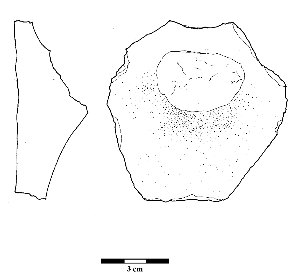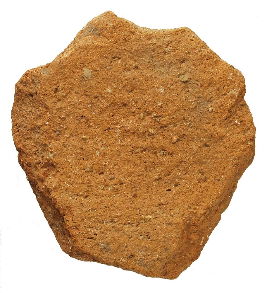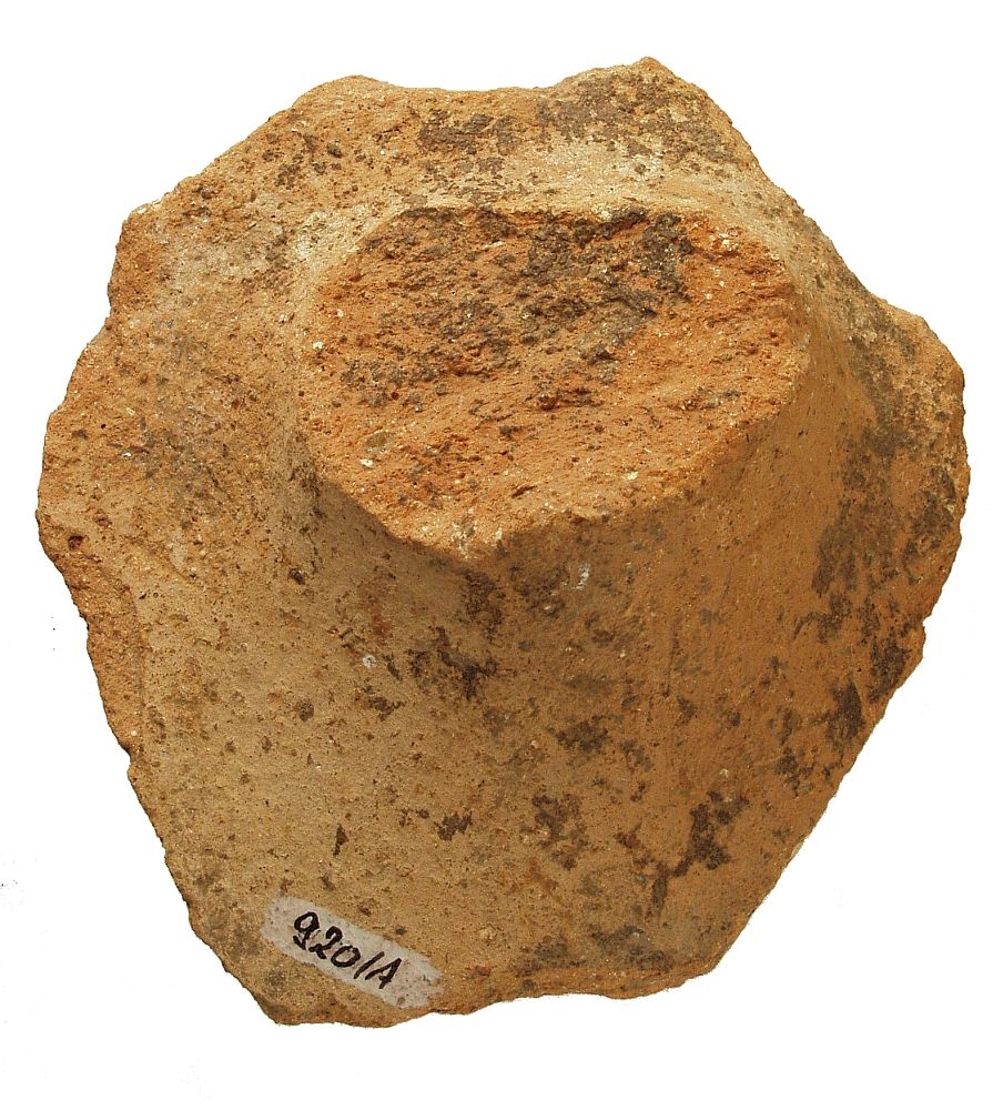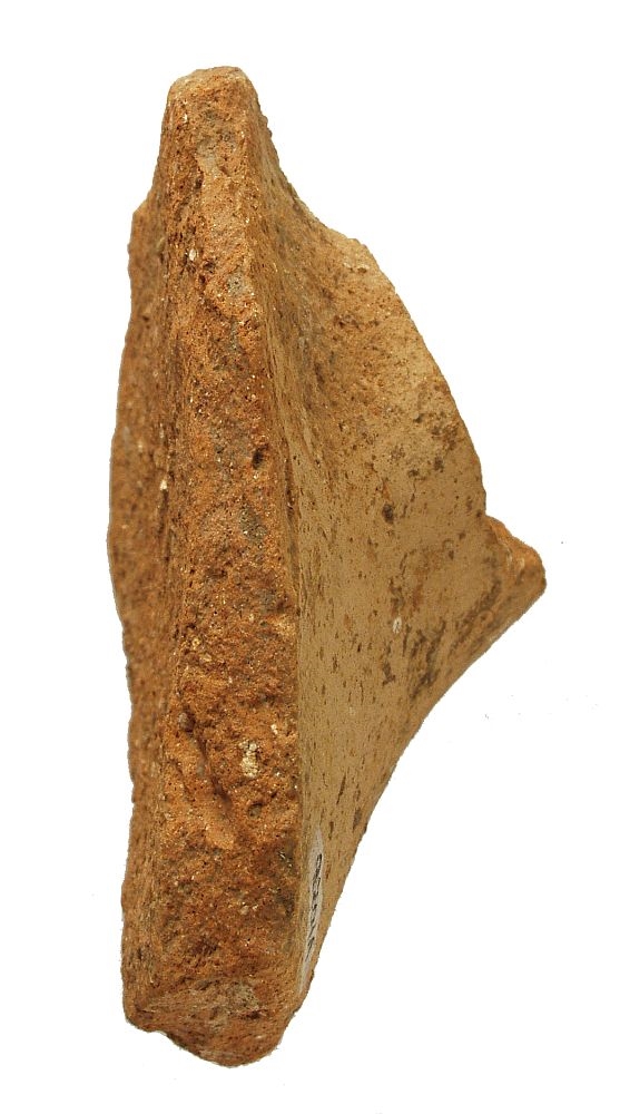 Ulomak spoja gornjeg dijela ručke ovalnog presjeka na vrat. Keramika je crvenkaste boje i s dosta primjesa kalcita.