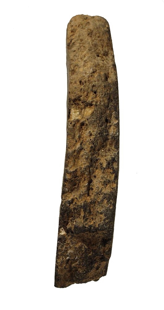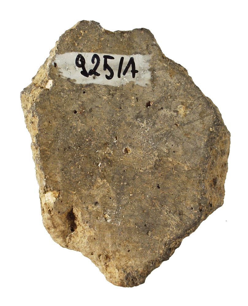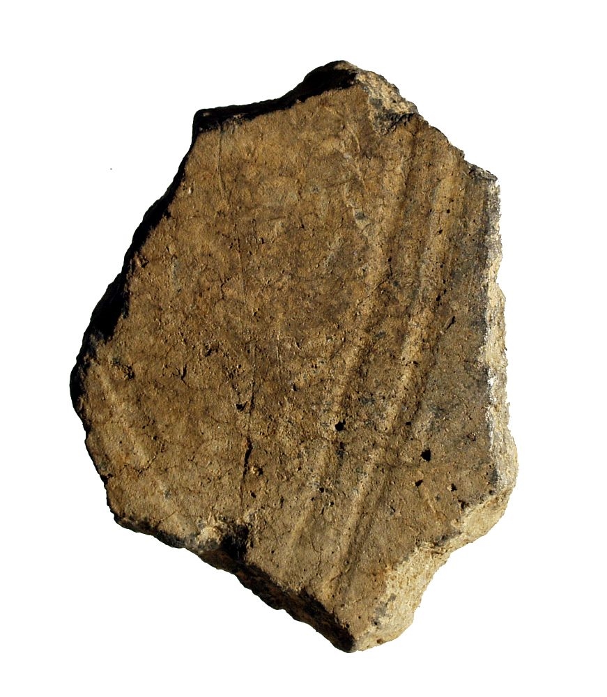 Ulomak trbuha posude koji jeukrašen dvijema paralelnim urezanim crtama. Keramika je sivosmeđe boje.