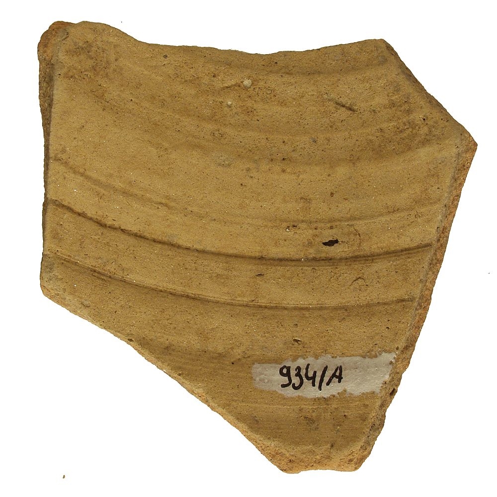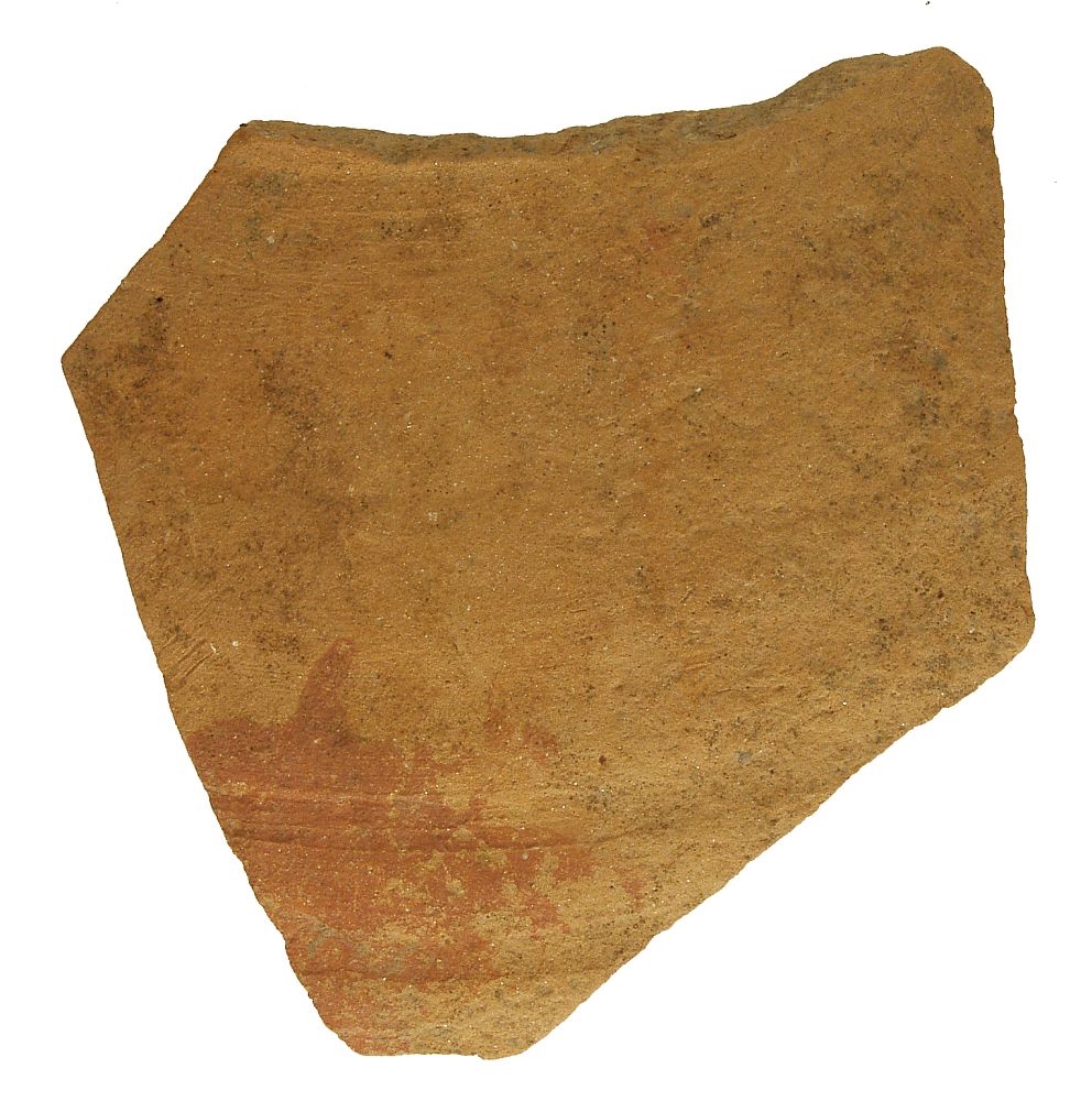 Ulomak ramena posude (amfora?) izrađene nakolu.Oker pečena, pročišćena keramika, ukrašena slikanim crvenim listom bršljana.