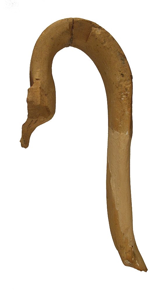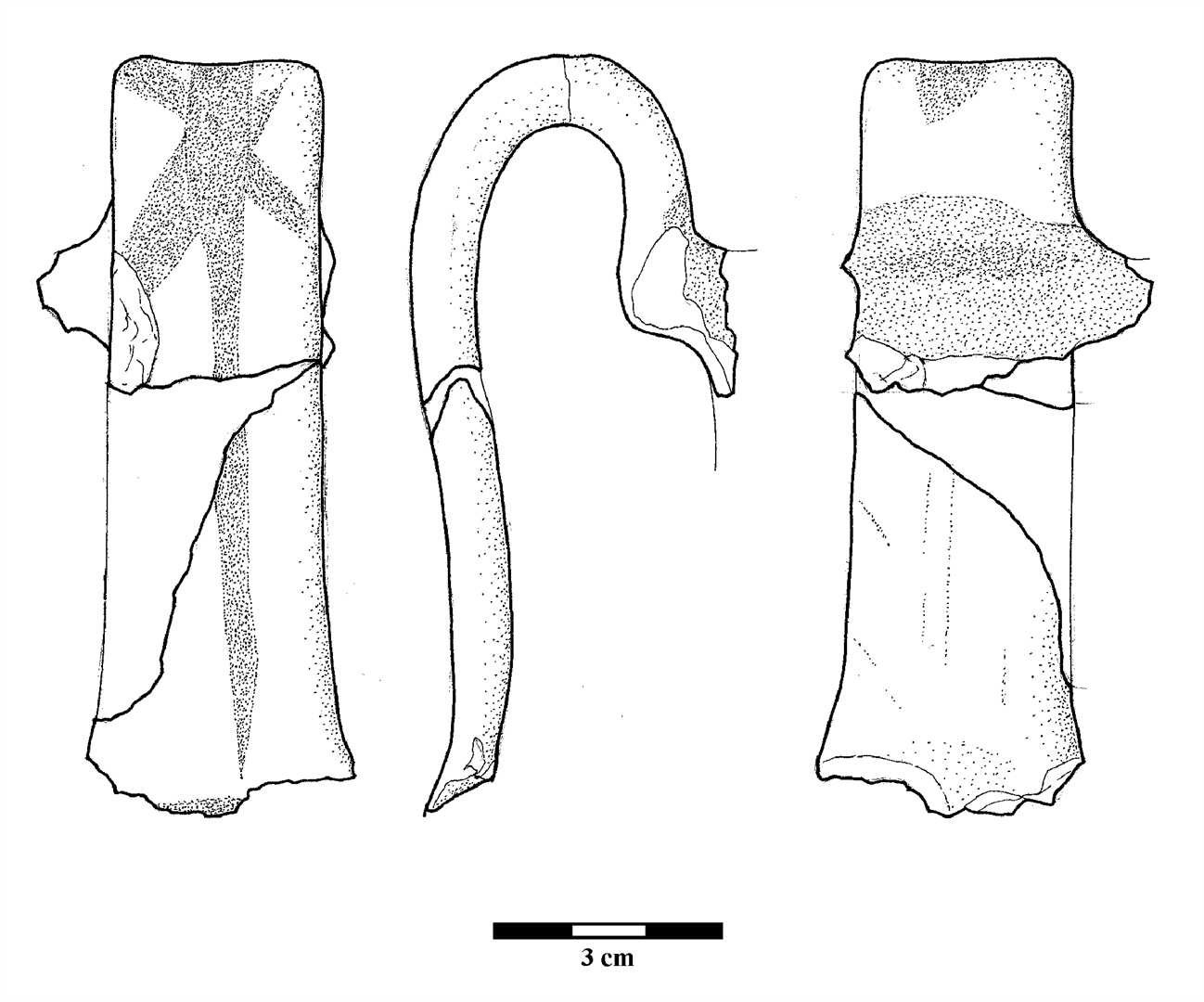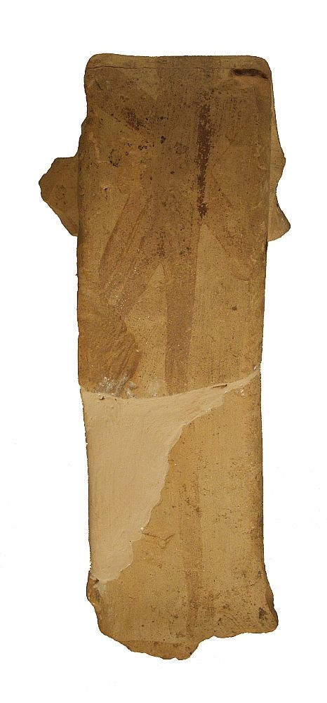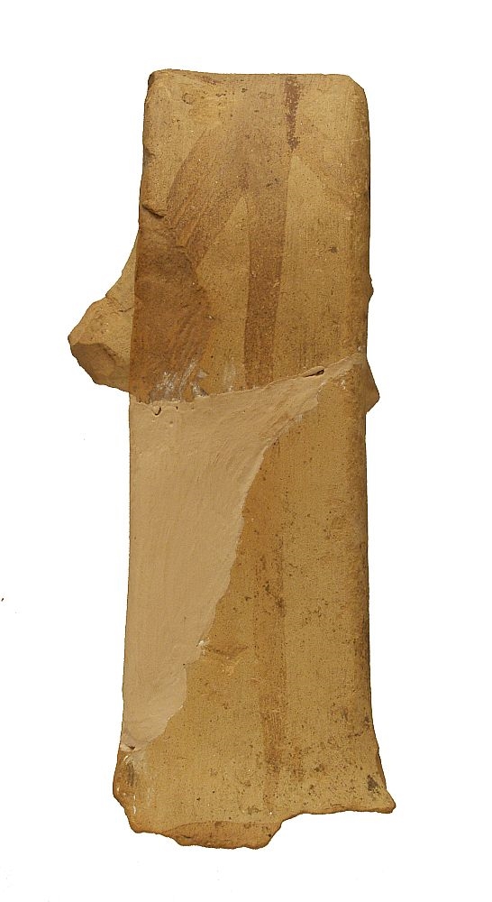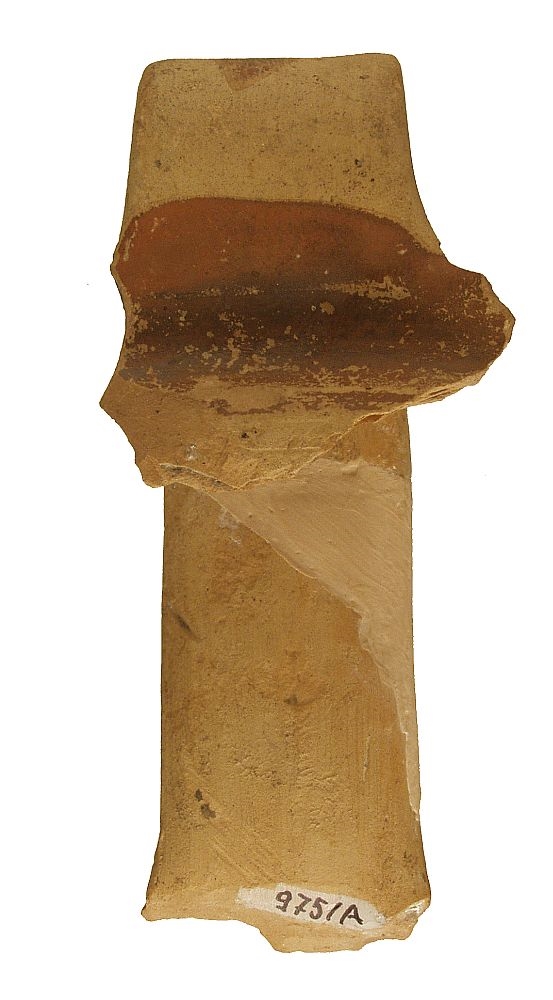 Ulomci visoke trakaste ručke i ruba ušća vrča izrađenog na kolu.Pročišćena glina, svijetlosmeđe pečena. Ručka je oslikana uzdužnom i križnim trakama smeđe boje, kao i unutrašnja strana ušća.